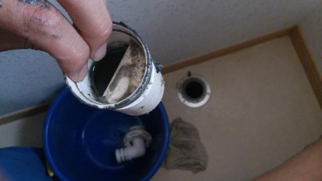 写真は床の中の排水トラップにゴミが詰まっている様子です。