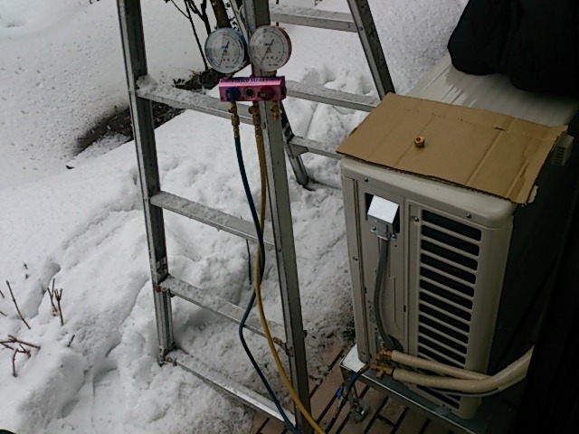 寒い日でしたが、何とか時々小雨程度で室外機取り換えも雨雪に合わずに済みました。
