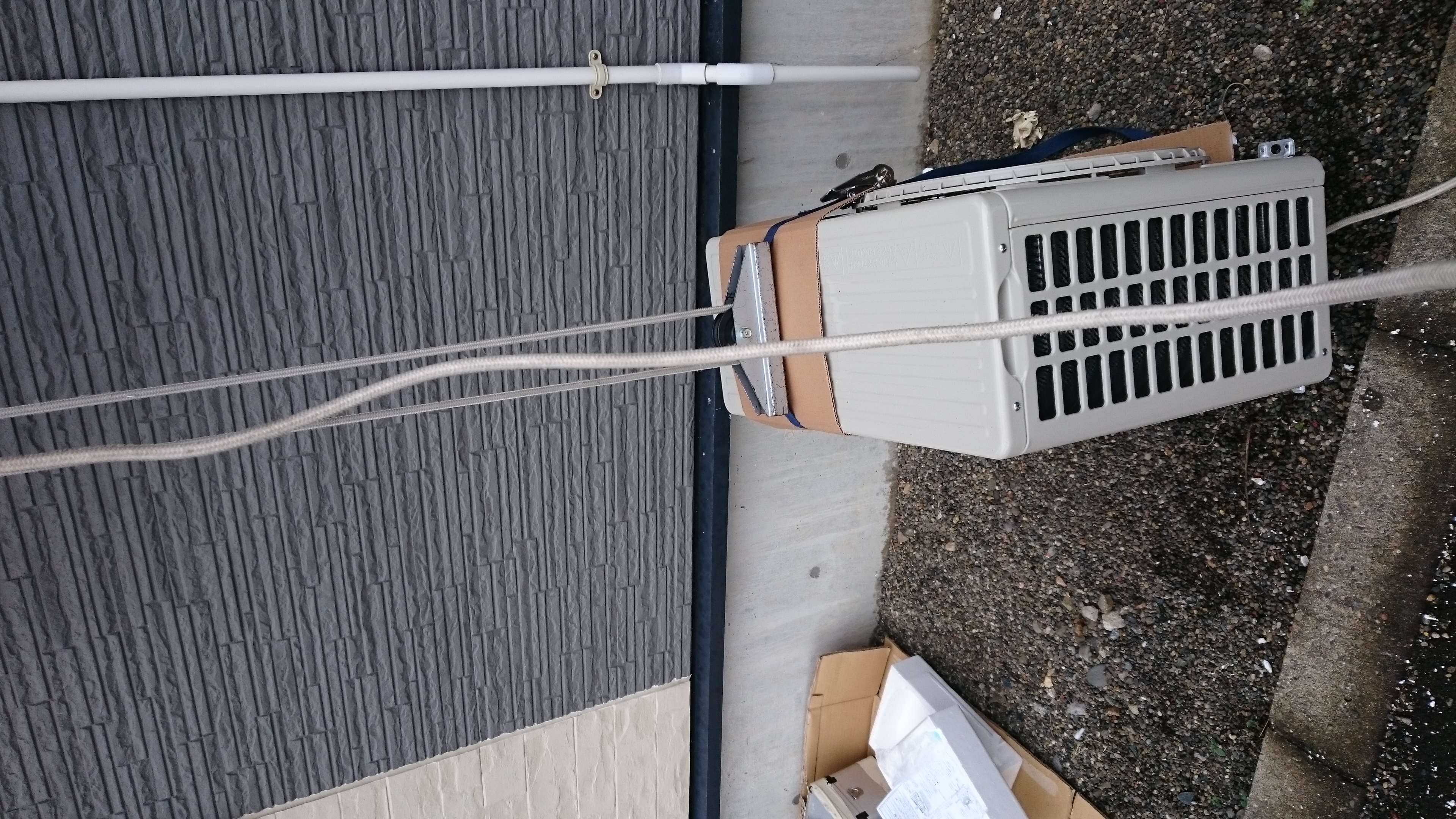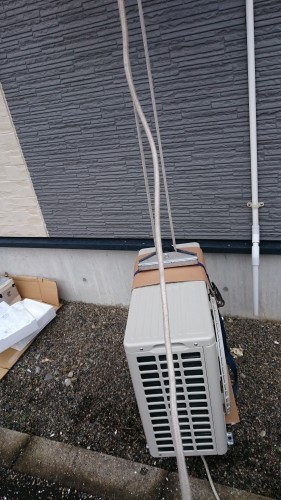 今日は、アパート2階のエアコン交換作業 高所のため、室外機は昇降機で引き上げの作業。