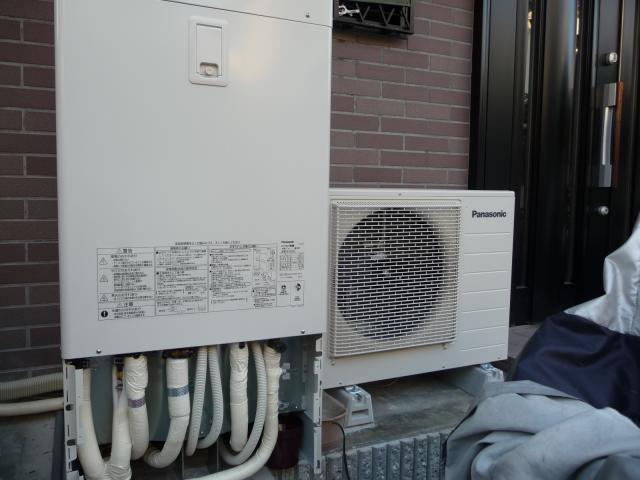 エコキュートの取付工事です。先行工事でIHクッキングヒータを