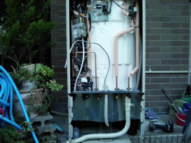 まず、給湯器を取り外し、その前にタンクを置くので、