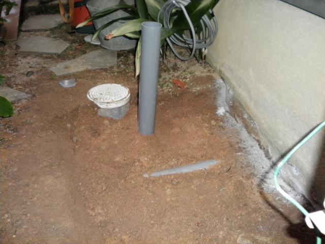 排水管を排水位置に、バラスを敷いて転圧、家の基礎にアンカーを