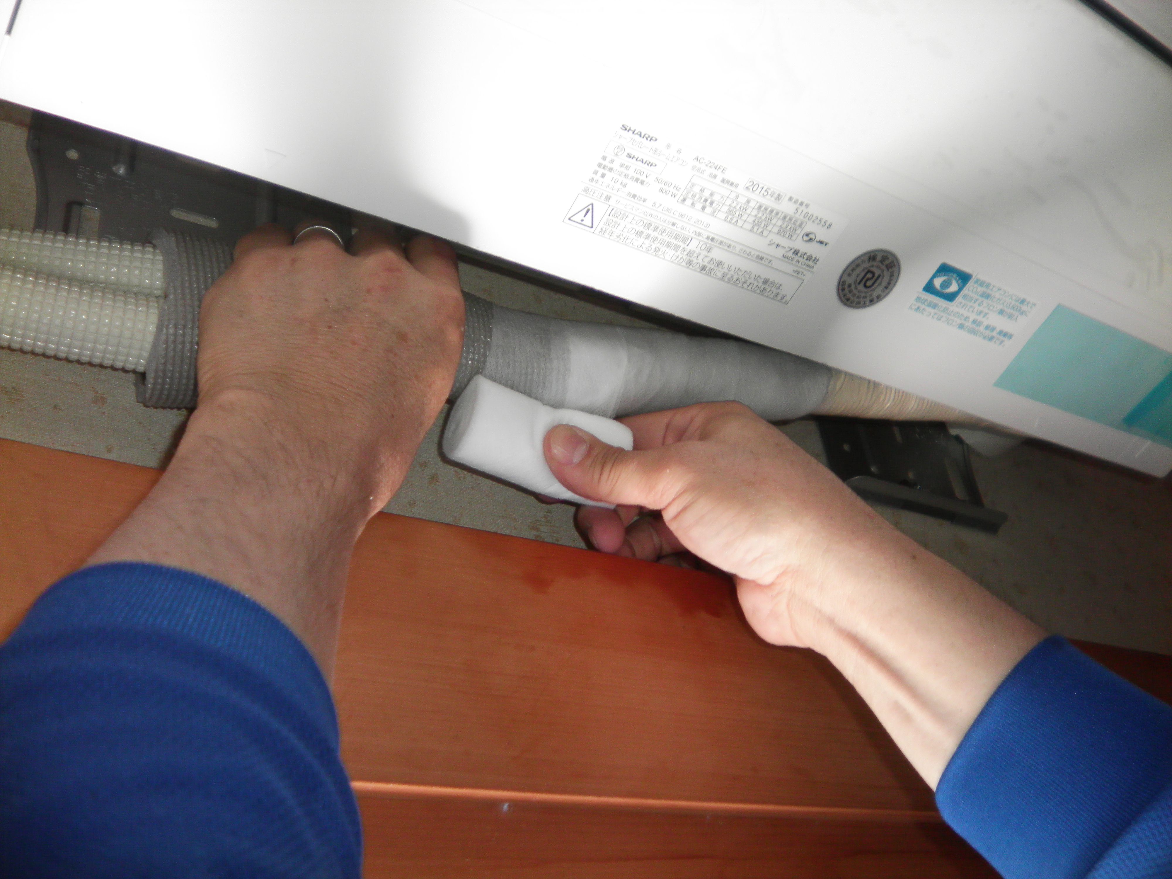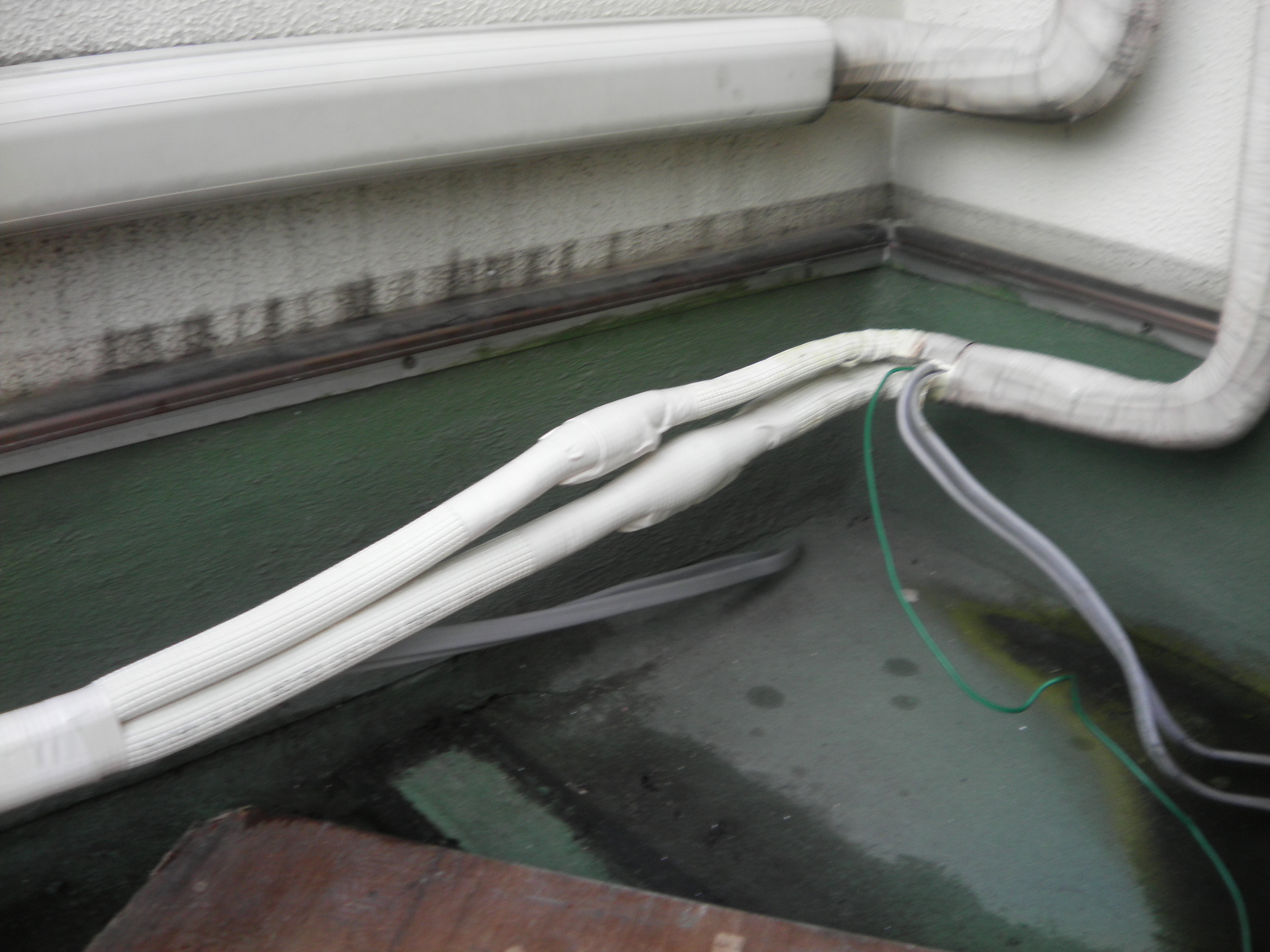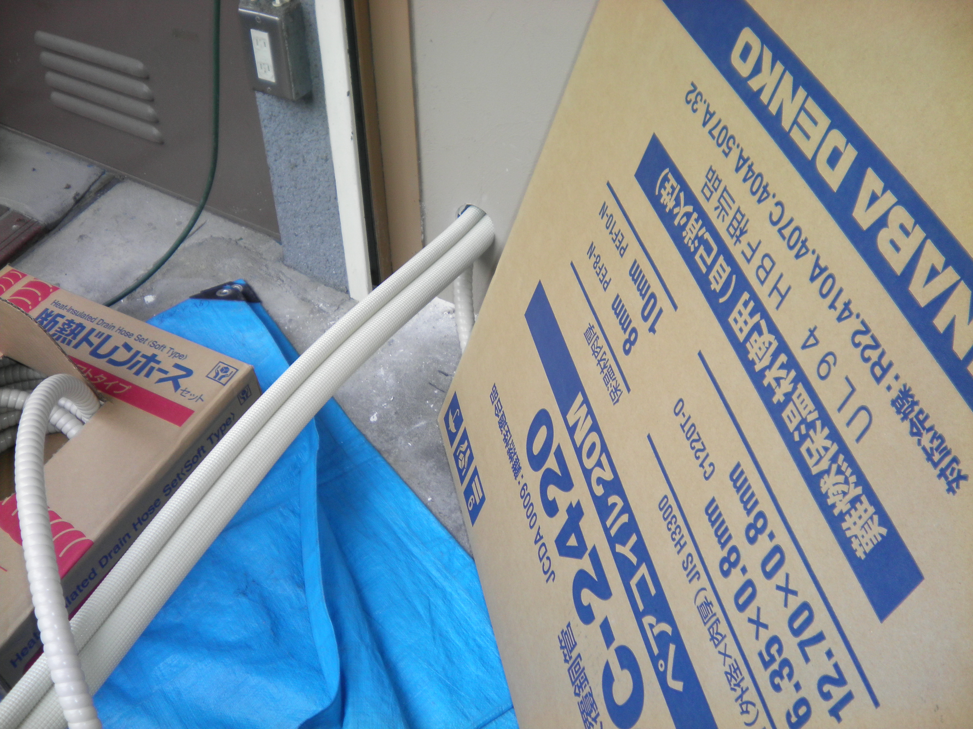配管パイプは先端までテープを巻き、ドレンホースにも粘着テープを