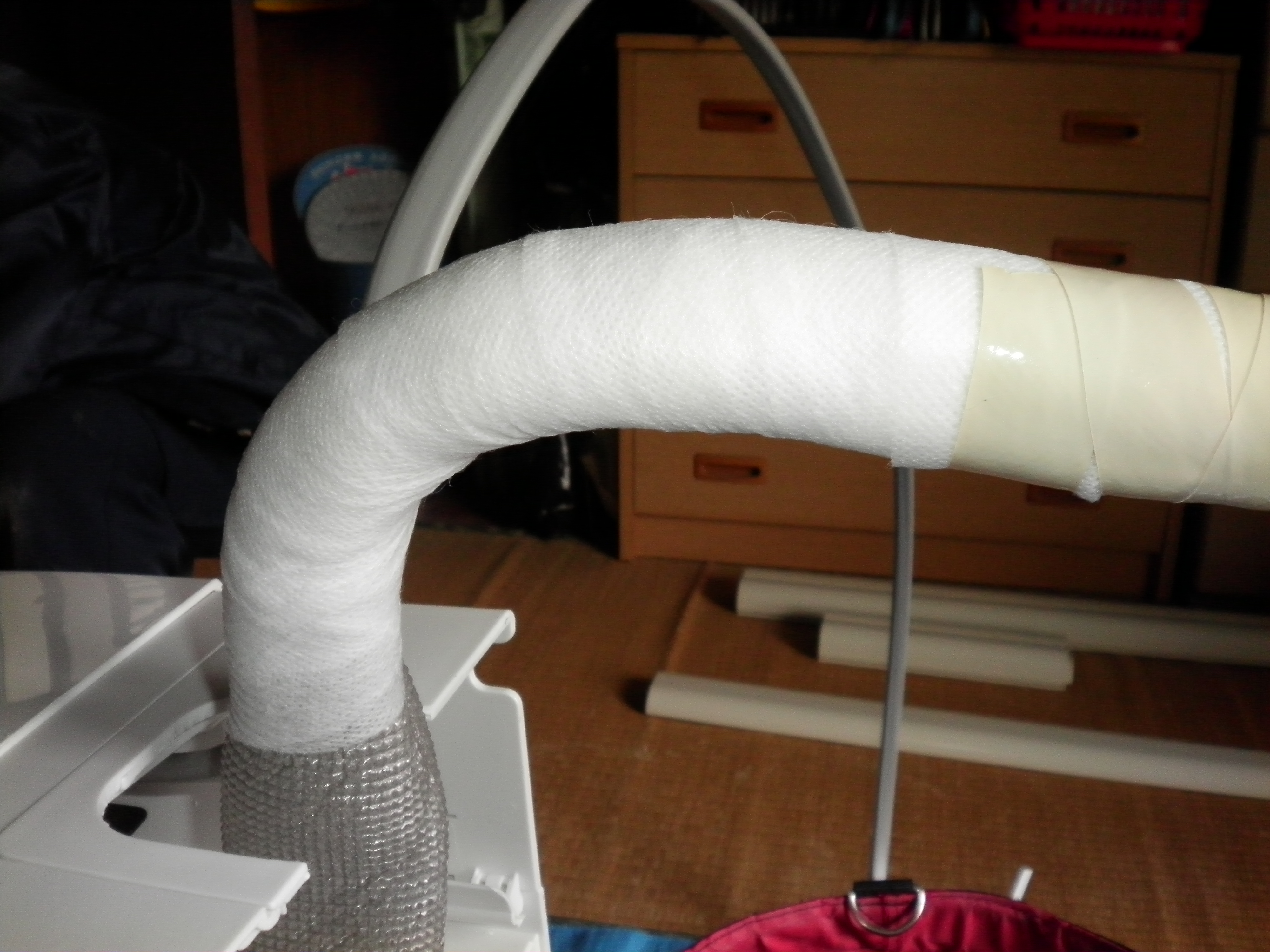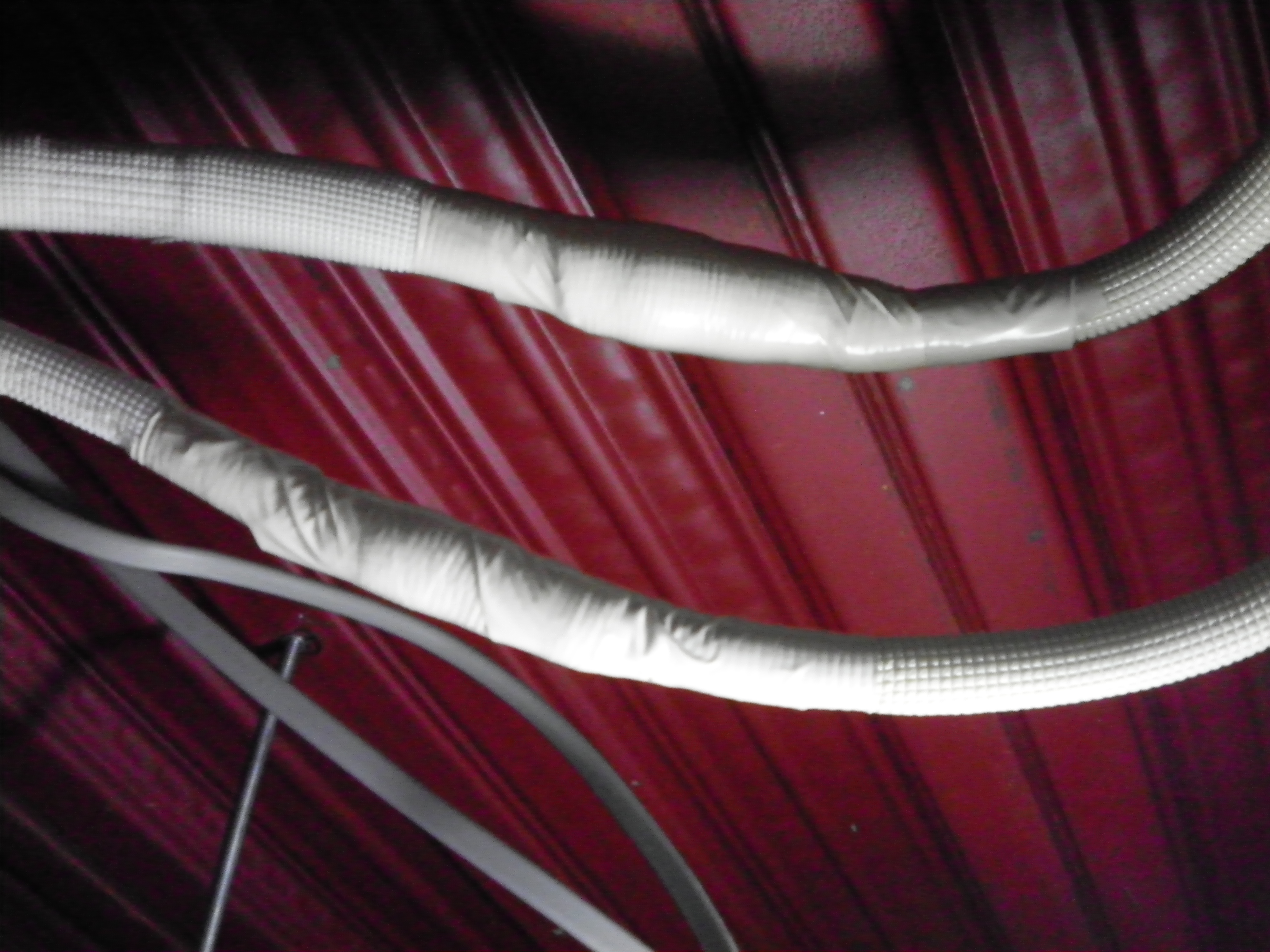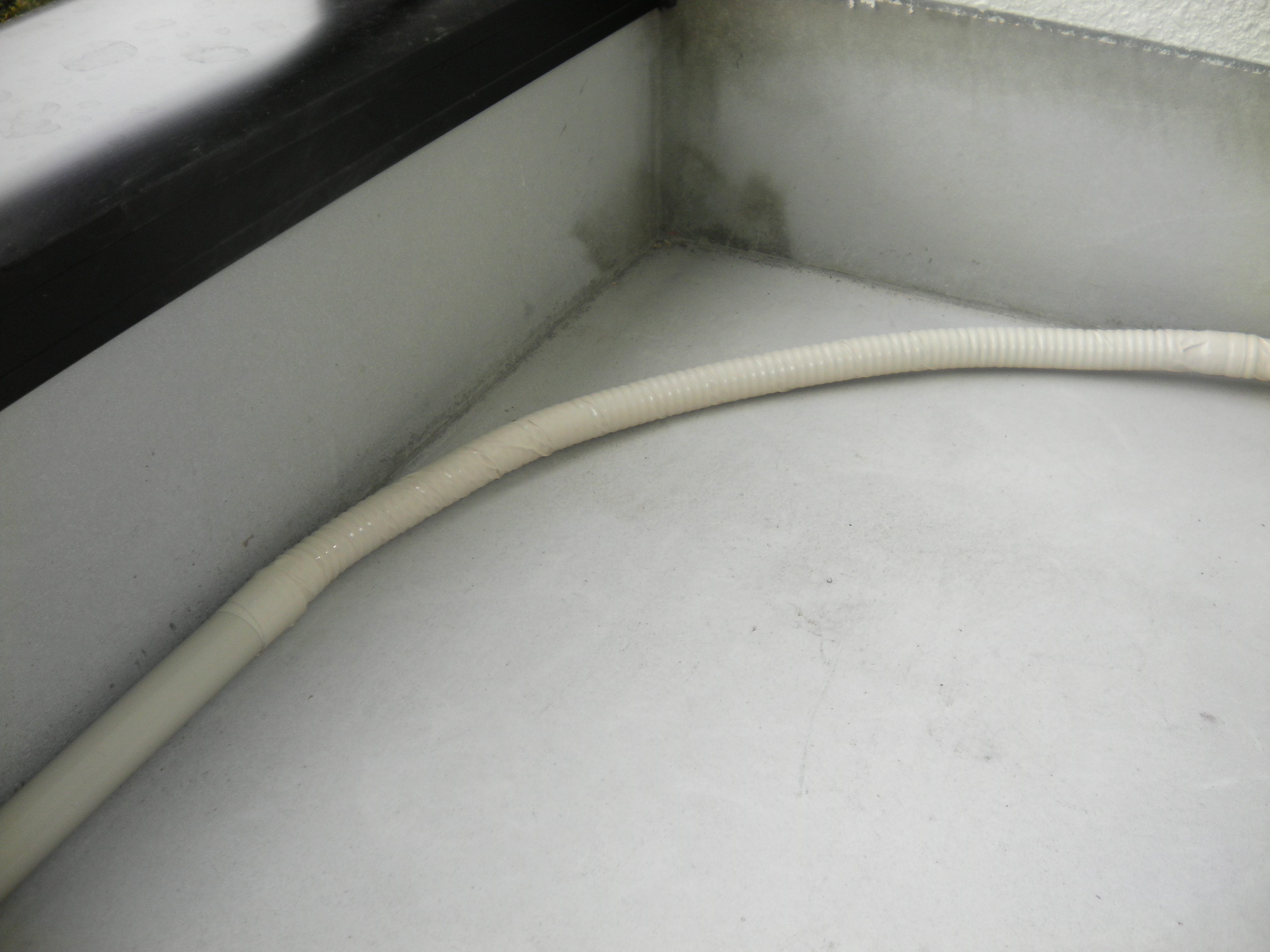 配管パイプは先端までテープを巻き、ドレンホースにも粘着テープを