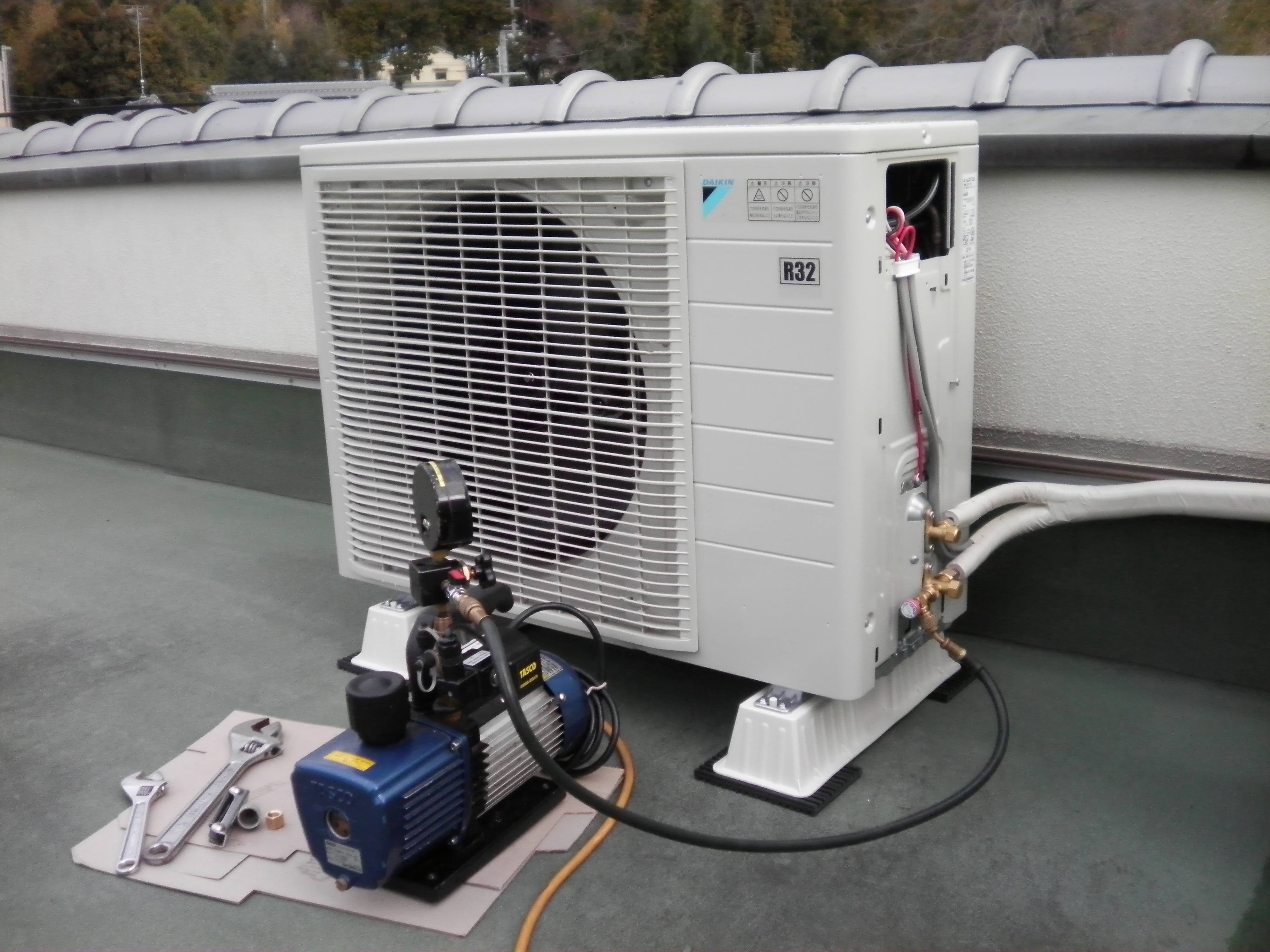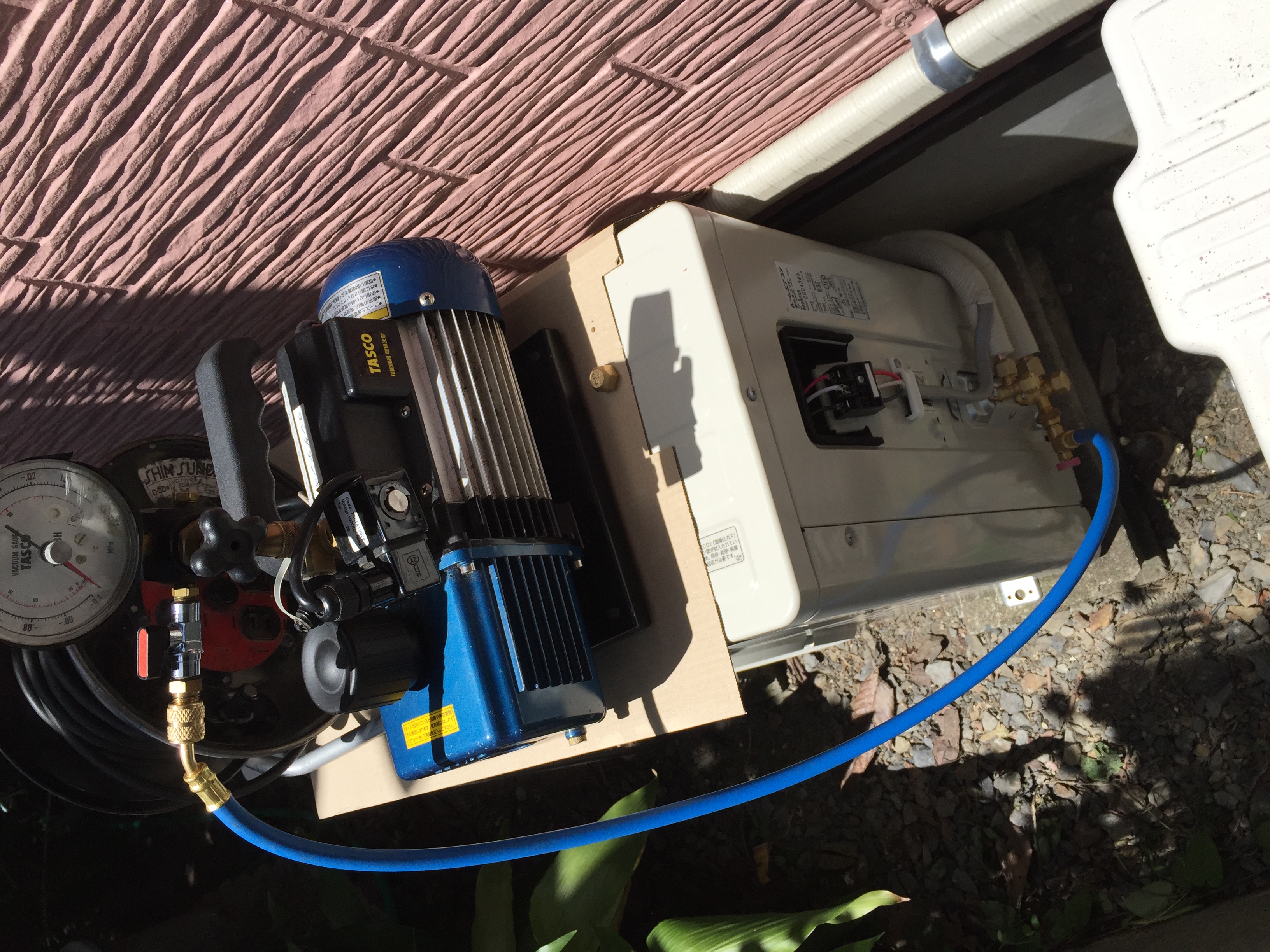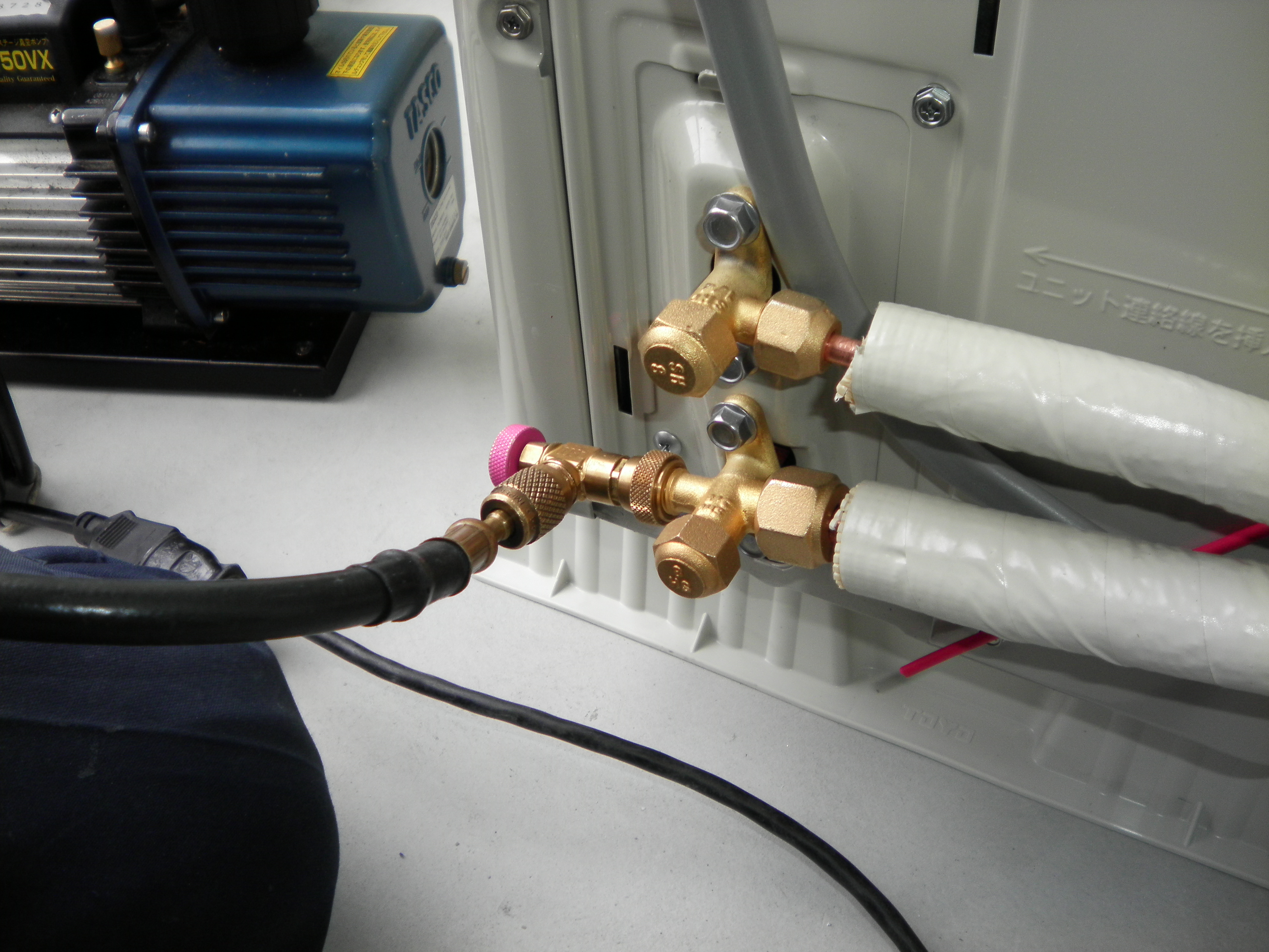 真空ポンプを使い、しっかりと配管内の空気を抜き、真空状態に