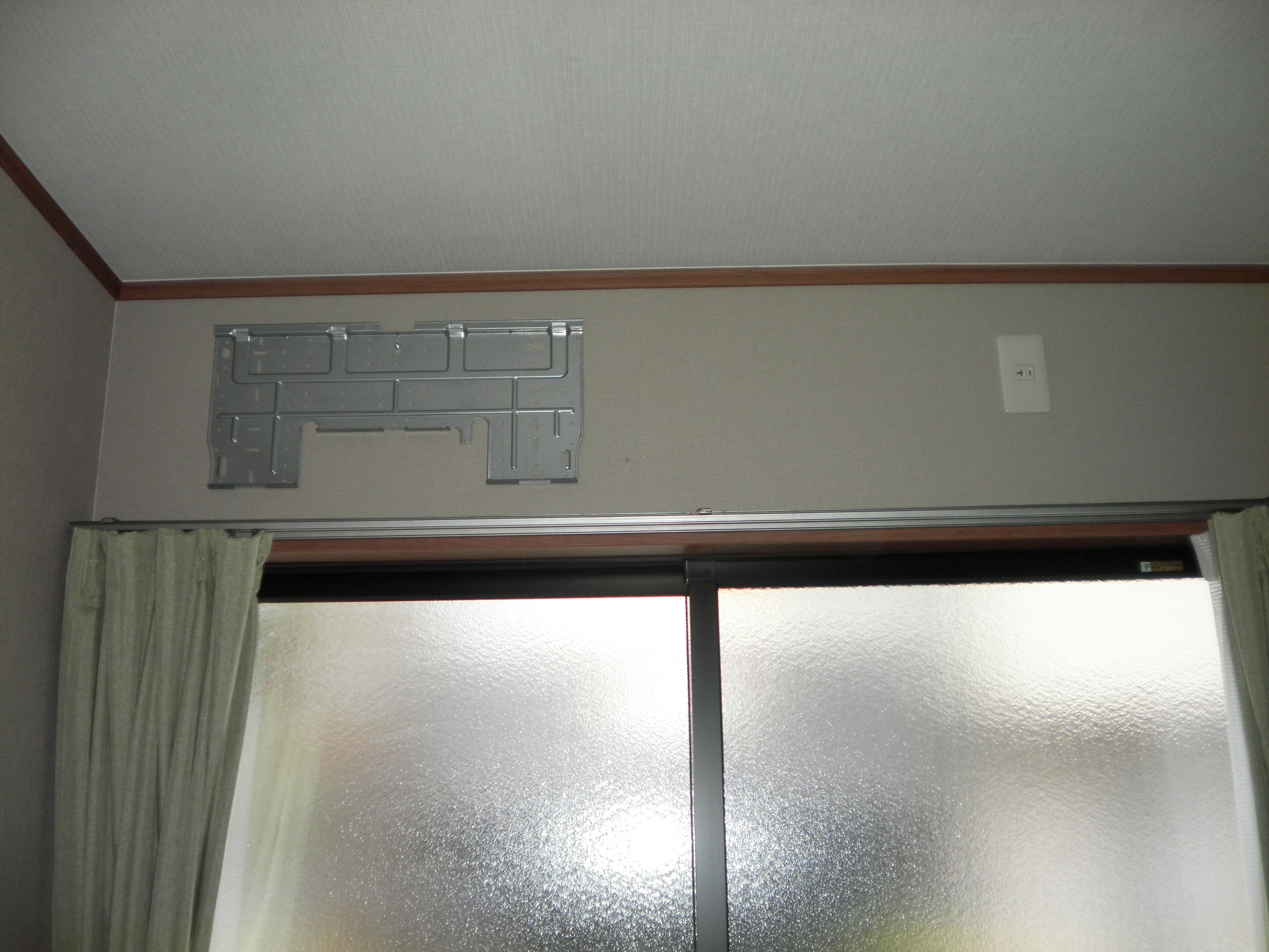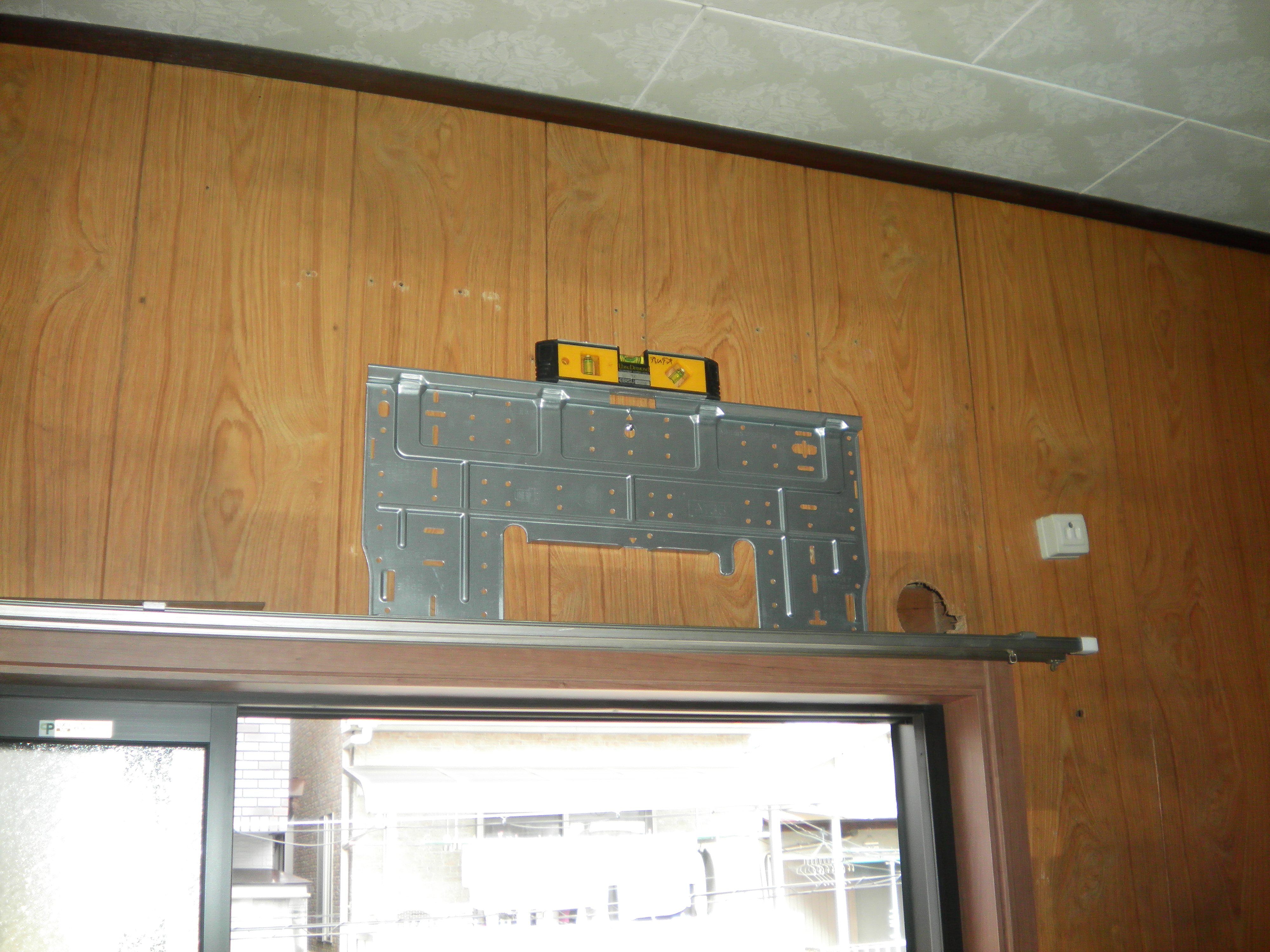 エアコン背板を仮に取り付け、壁に穴をあけます。