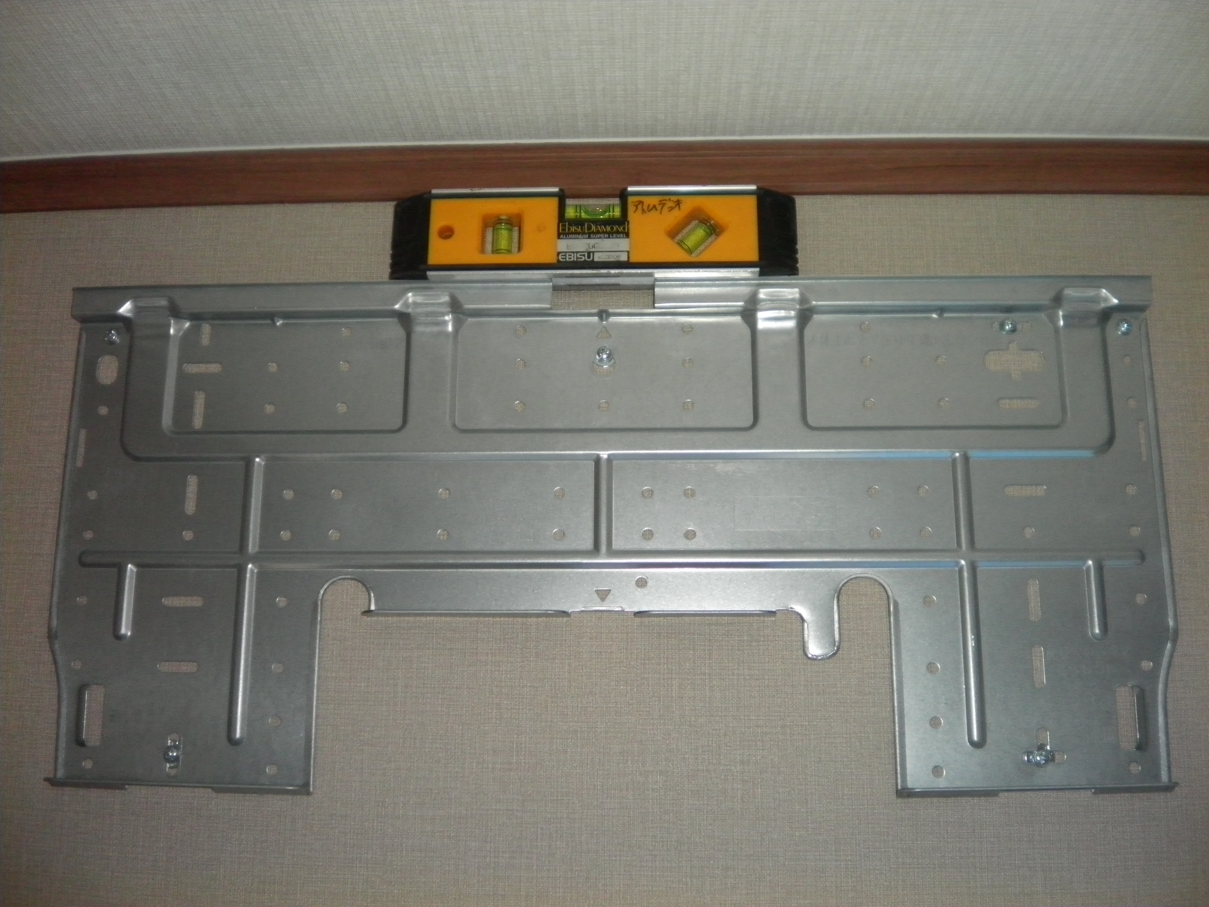 水準器を使い、背板を取り付けます。この壁は石膏ボードでしたので