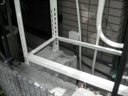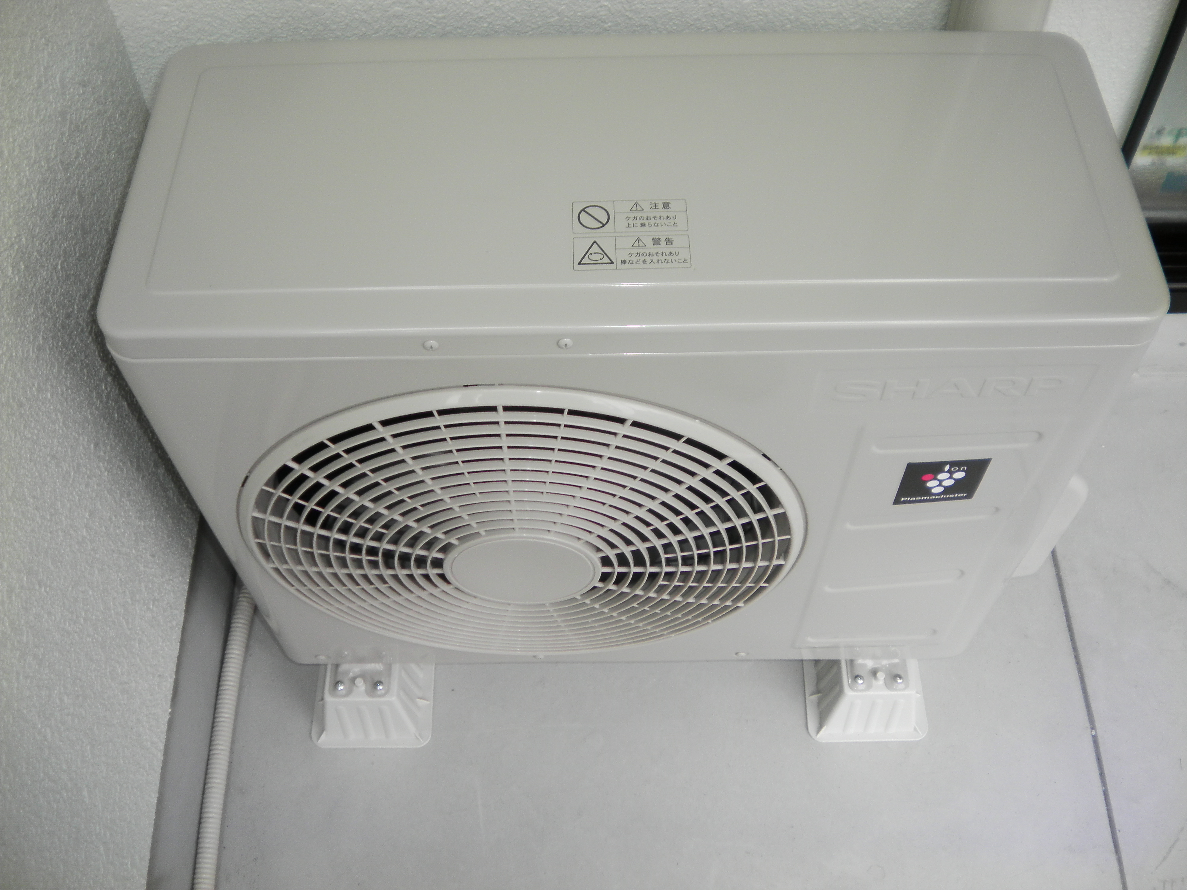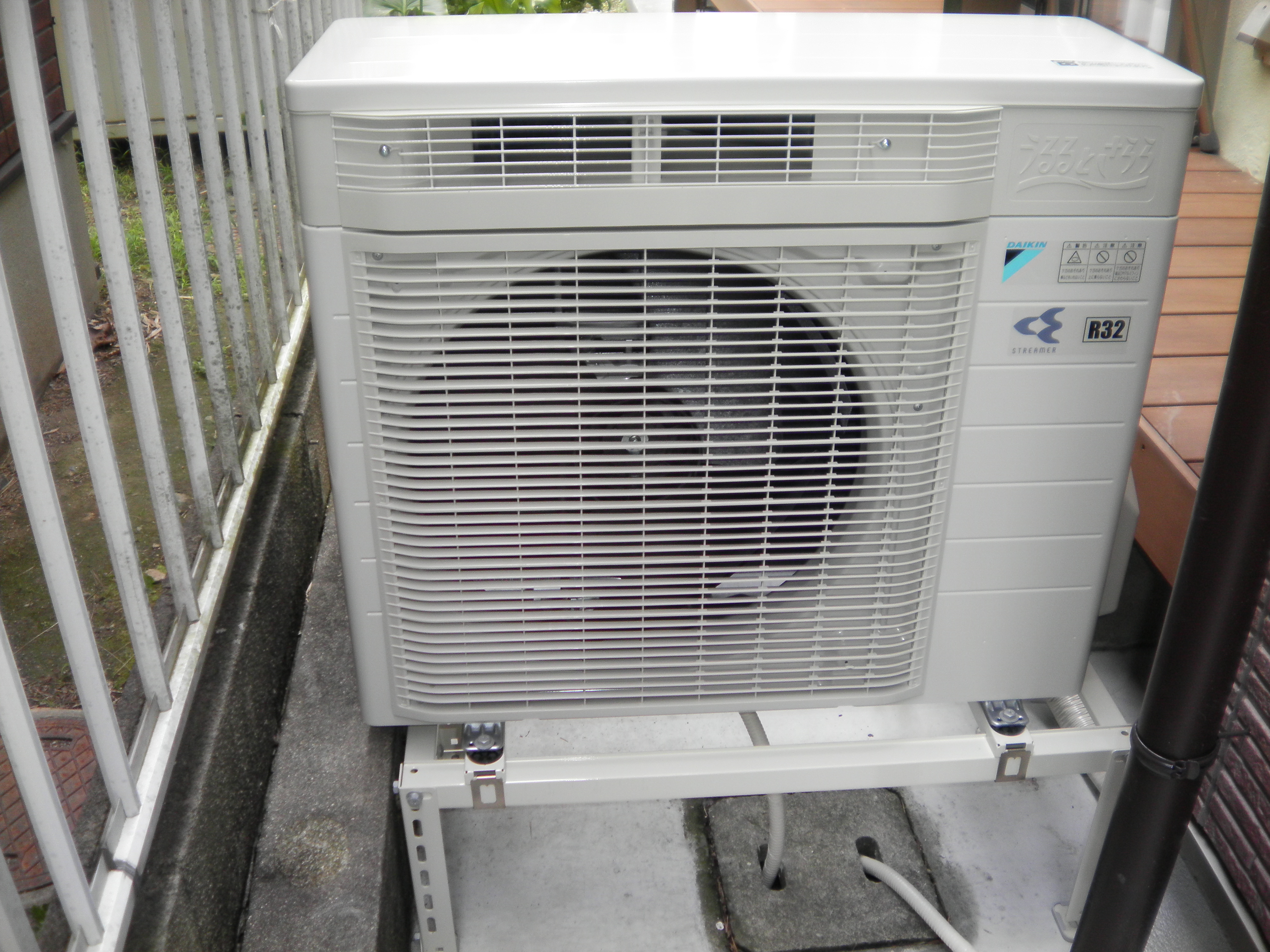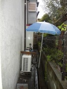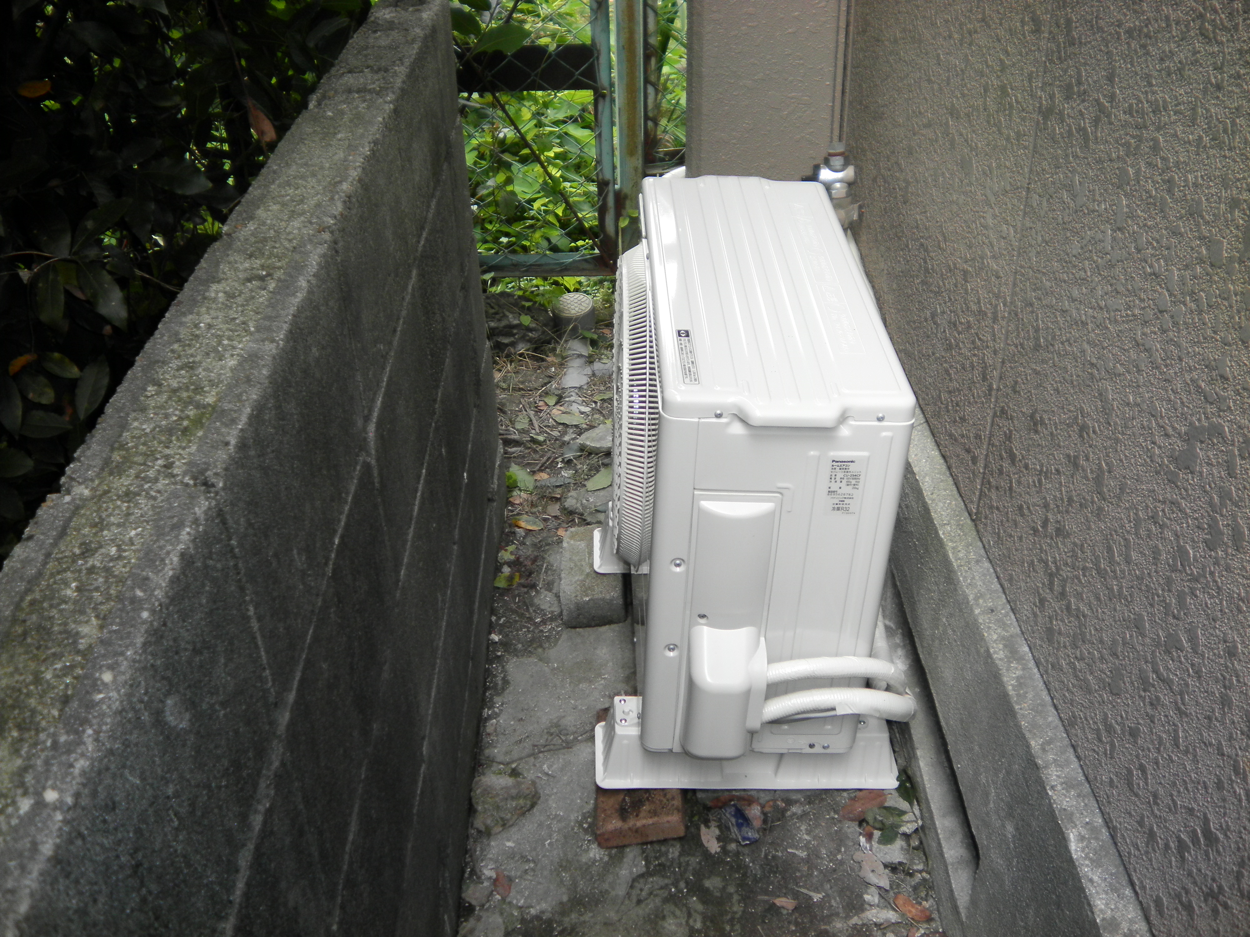 室外機設置場所の土間が土ですので泥や雨などでの跳ね返り室外機が