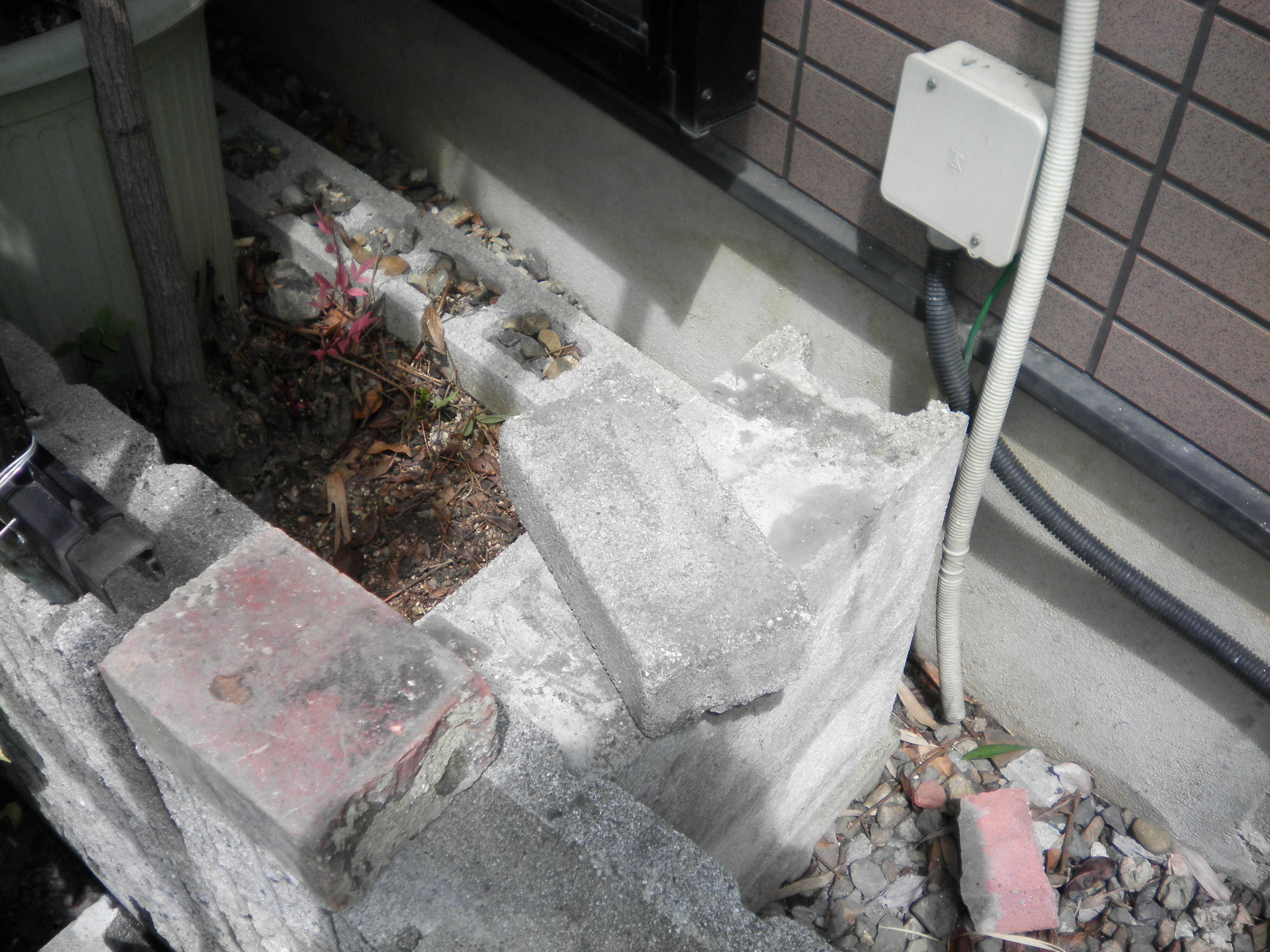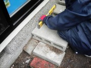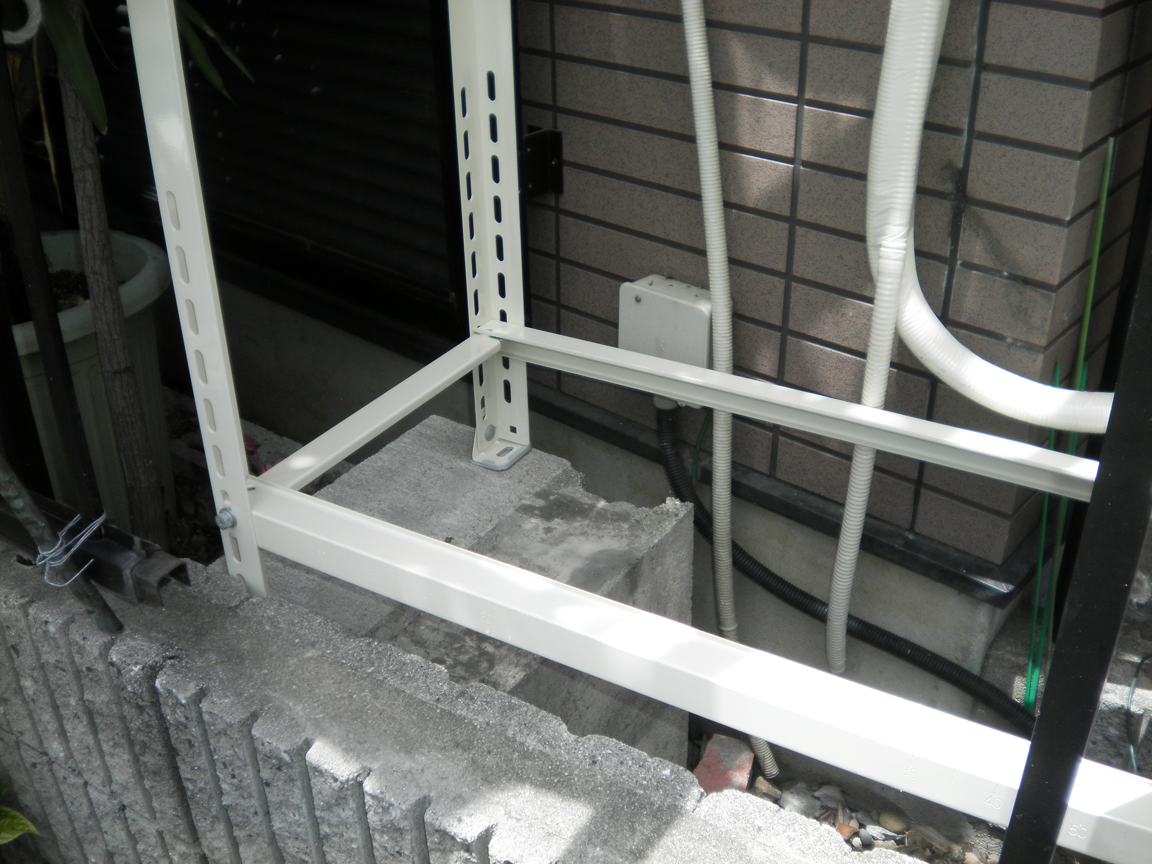傷まないようにブロックを下に敷いて室外機をのせます。もちろん