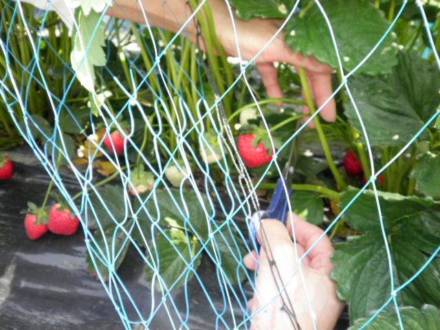 妻が収穫、赤く熟したイチゴをはさみで摘み取ります。