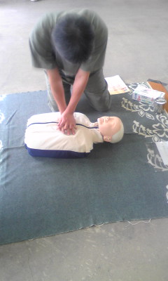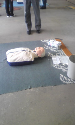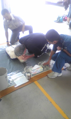 消防署のガレージで三班に分かれ、お人形を使い実習をしました。