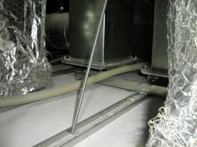 点検口から天井裏をのぞき取付位置を確認し、 3/8ボルト(ズンギリ)で取付金具を固定します。