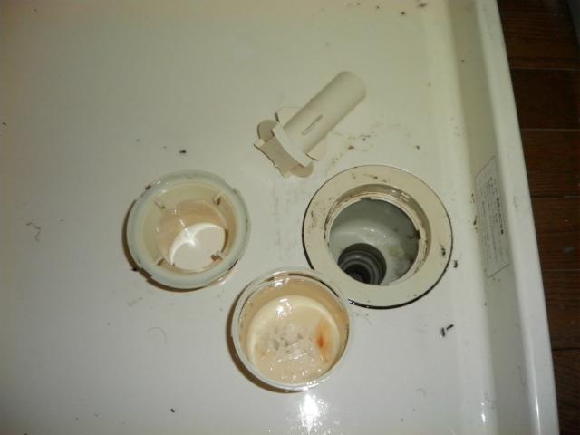 既設の洗濯機を撤去して、洗濯板の排水口の掃除をします。