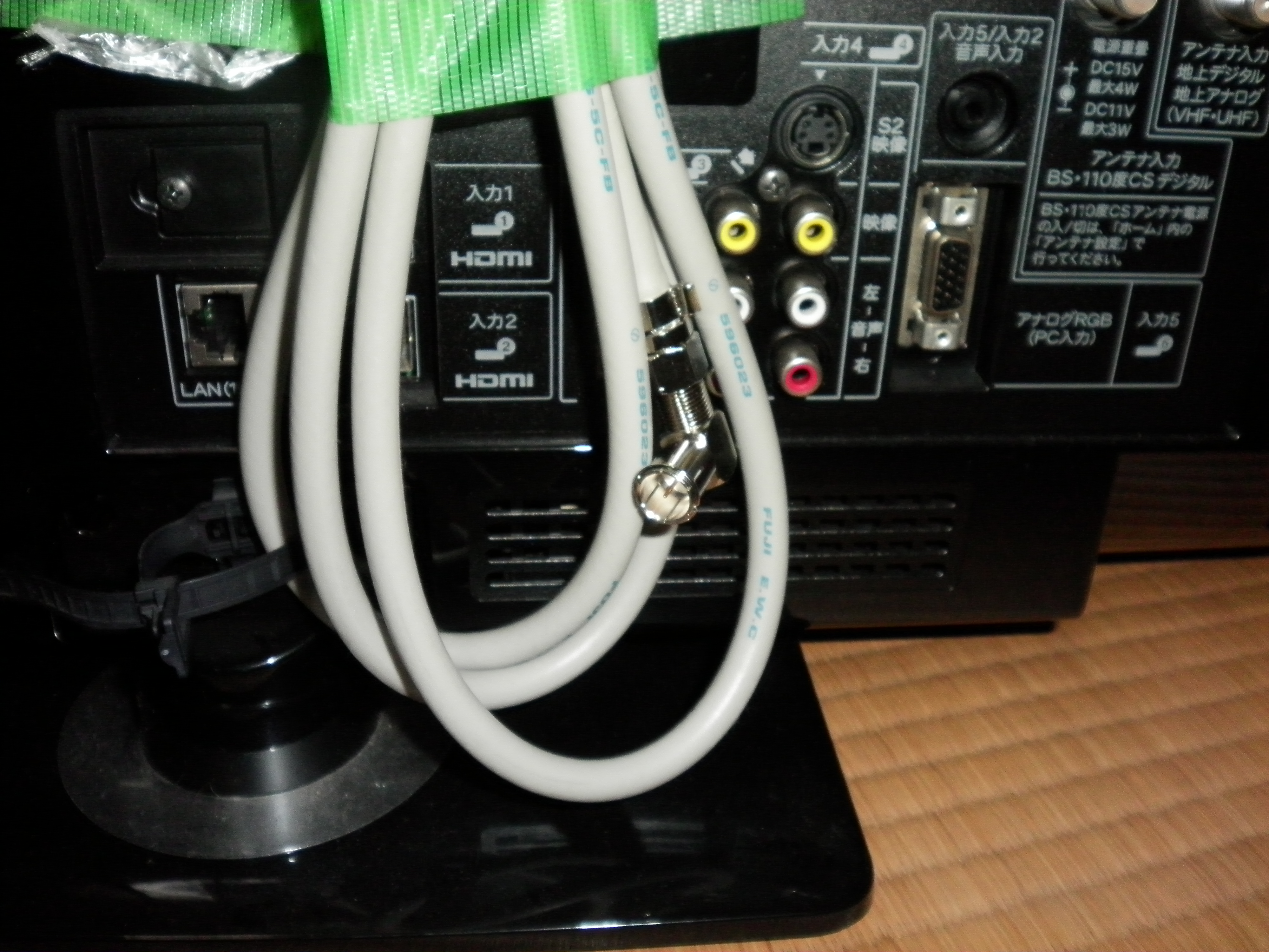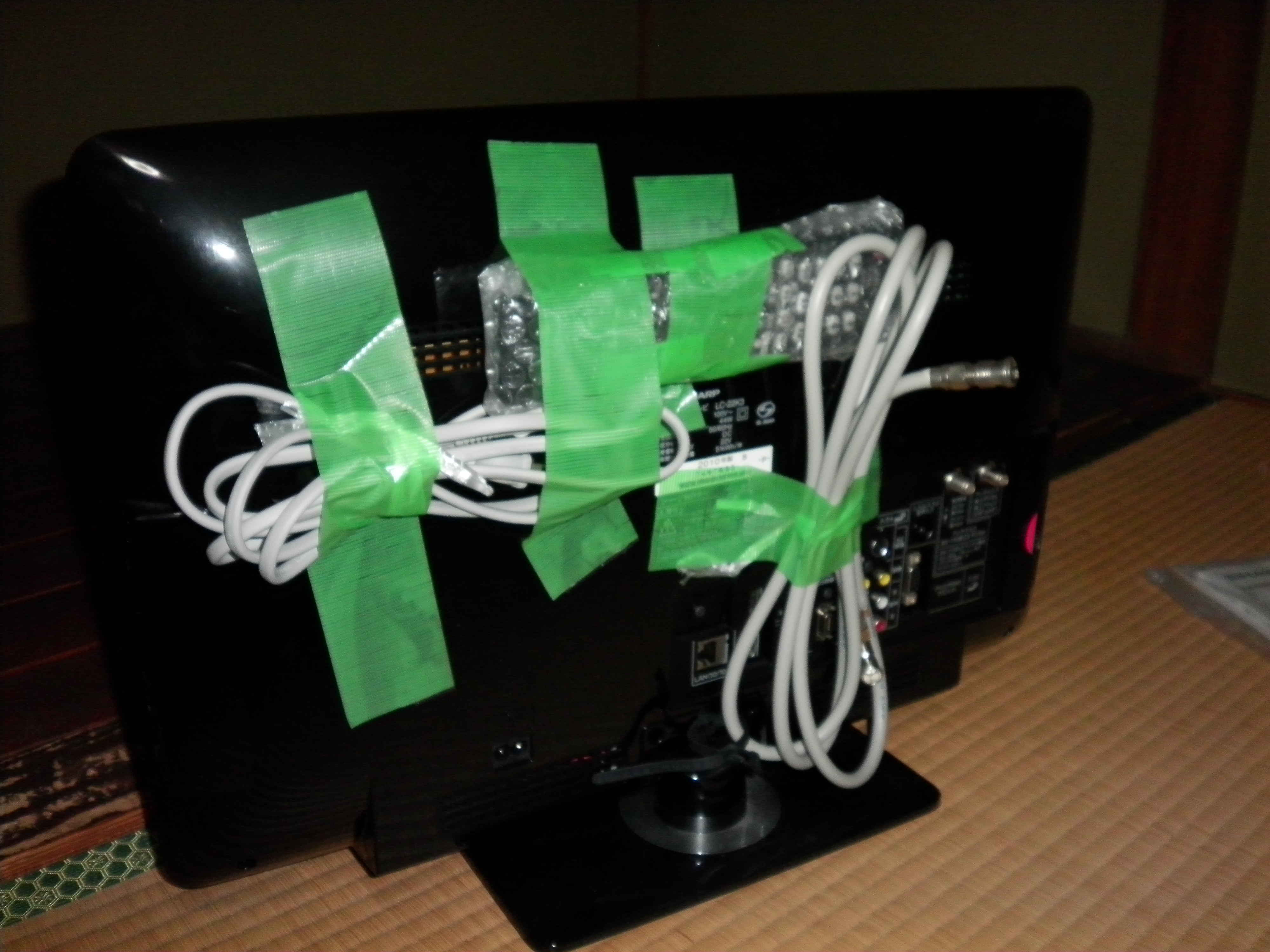 アンテナコードをテレビの裏面に養生テープで貼りつけておきます。
