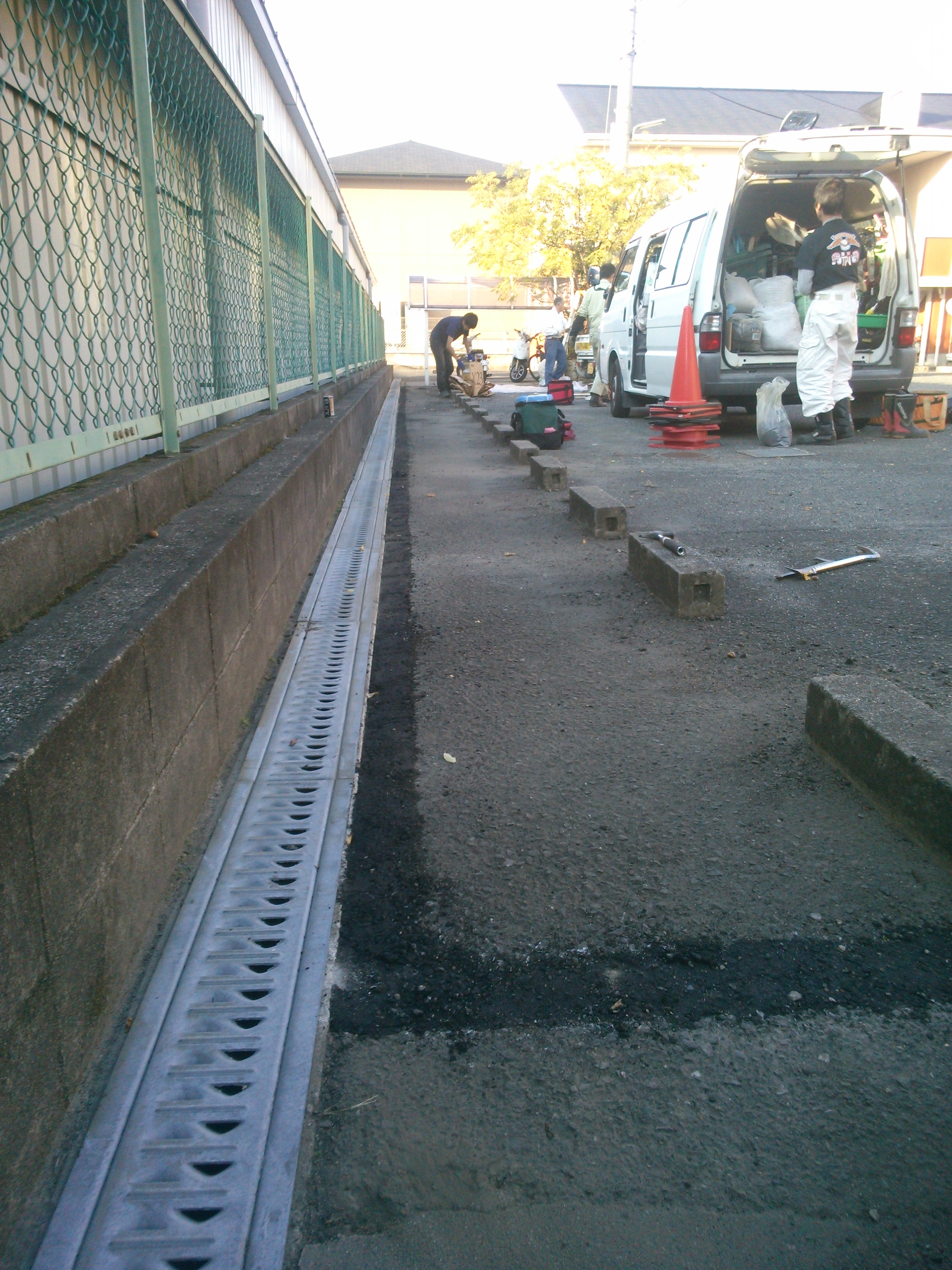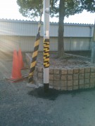 2本のポールを建柱し、アスファルトで埋戻し。注意喚起のために トラトラテープを巻きます。