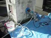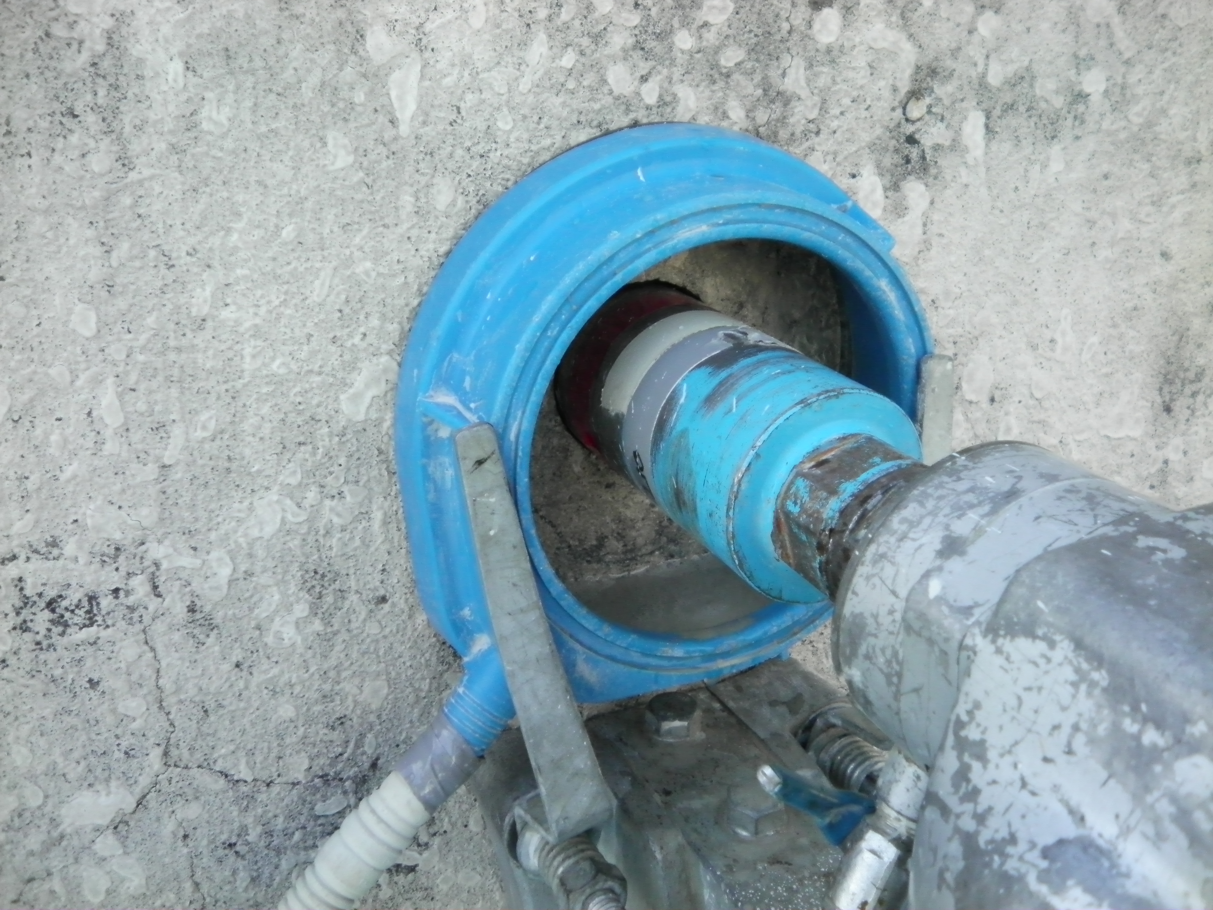 コンクリートなので湿式コアで穴をあけます。壁の向こう側は