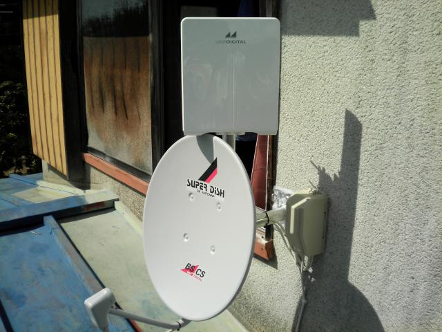 2階の壁面に金具を取り付けBSアンテナと地デジ用の平面アンテナを取付ました。