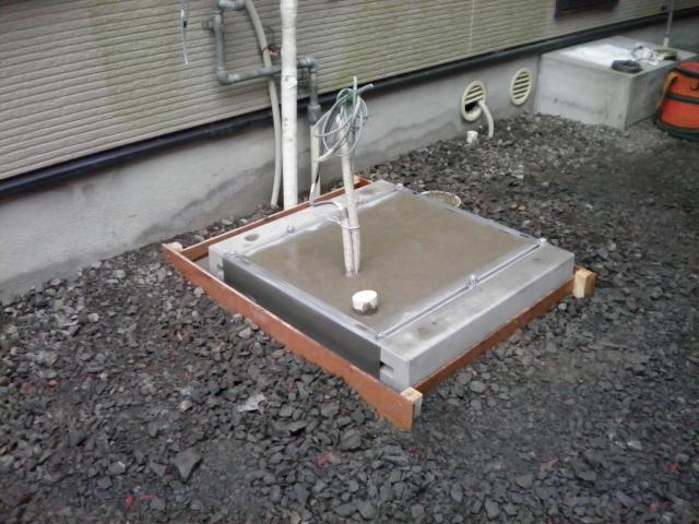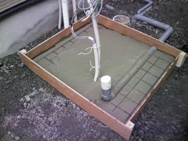 基礎工事です。木枠をつくりベースを作ります。排水菅と電源