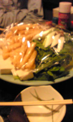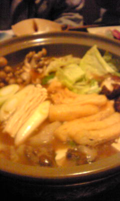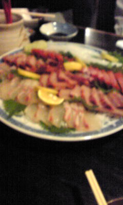 刺身にしし鍋をいただきました。携帯で撮影したため、すこしおいしさが伝わりにくいかもしれませんが、 たいへんおいしかったです。気のあった6名+1名でわいわいがやがやと楽しく過ごしました。 お互い年末までがんばろうと誓った夜でした。