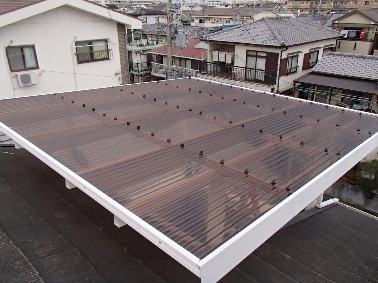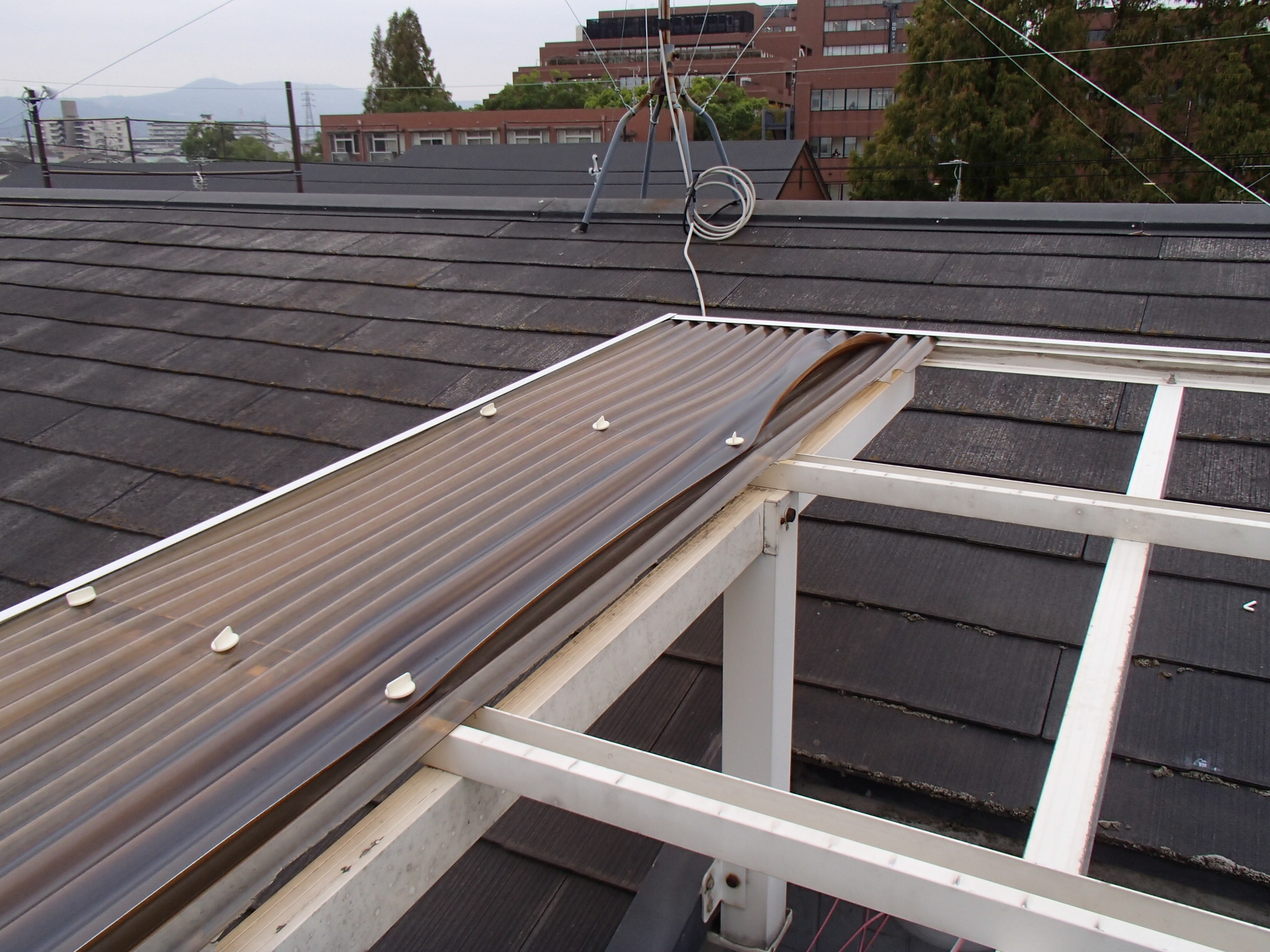 吹き飛ばされて1枚だけになっていた波板をきれいに張り替えできました。