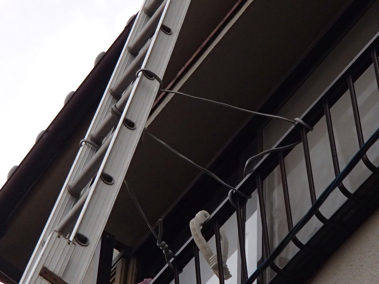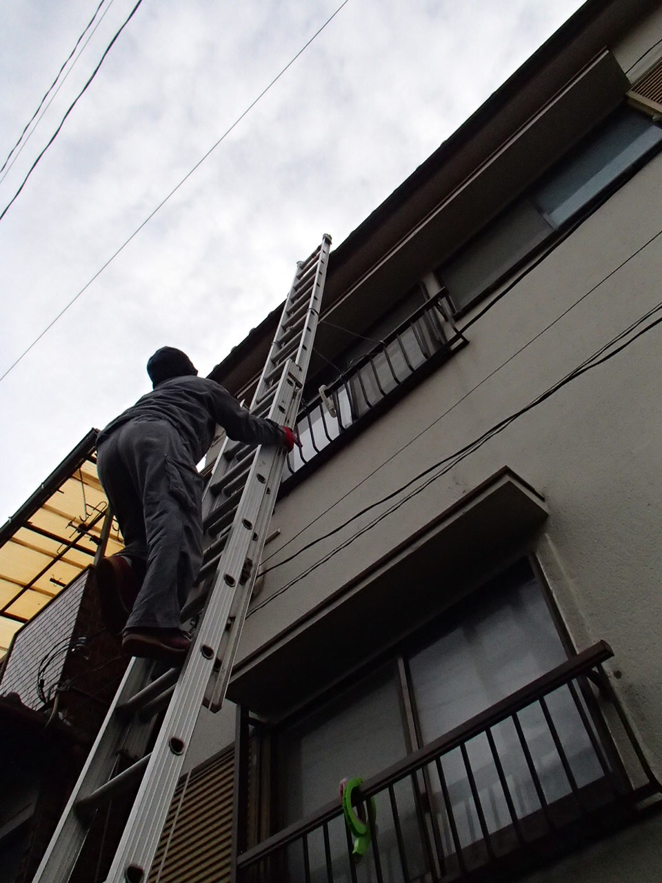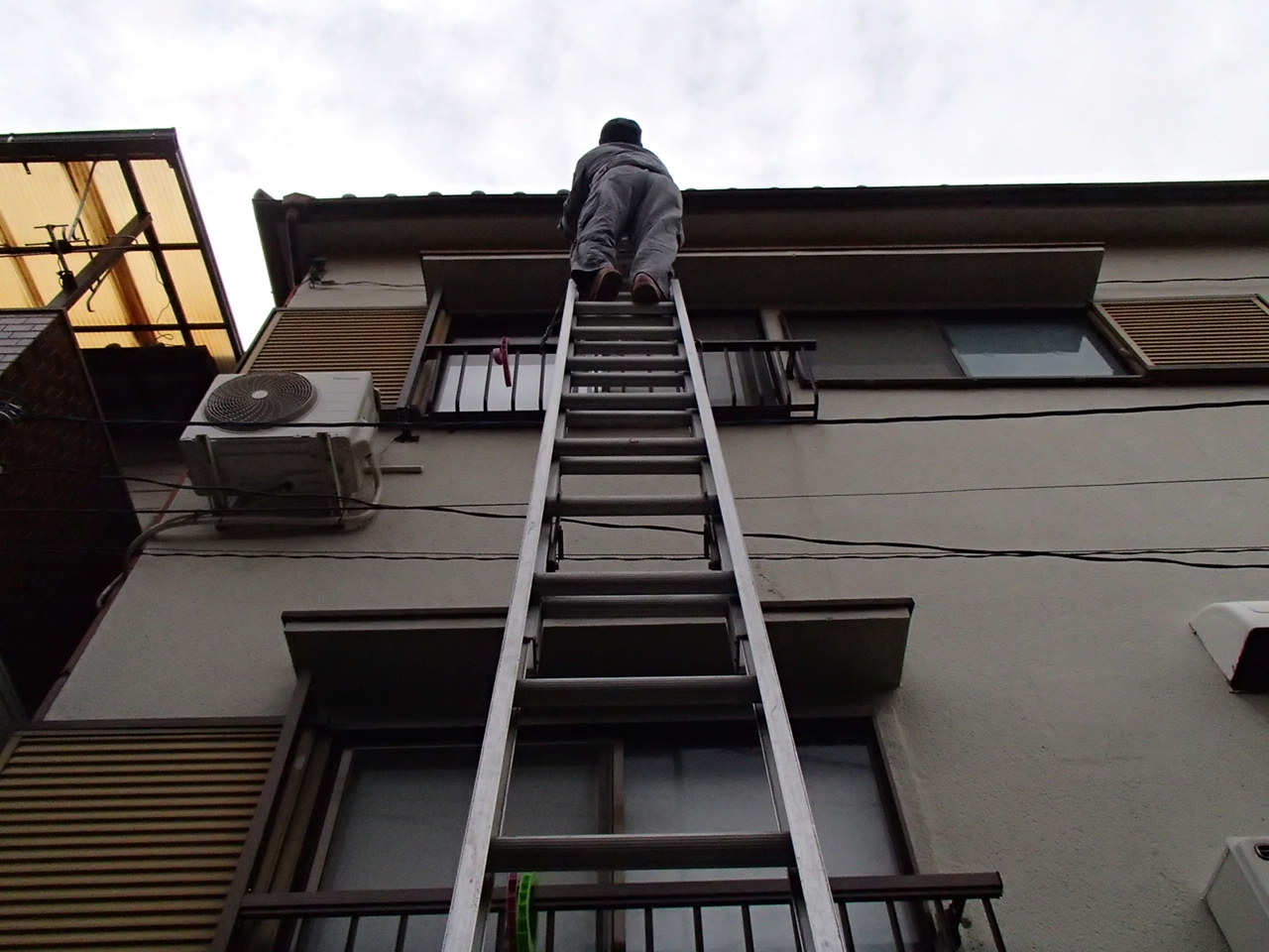 3階の屋根まで届く、ロングの梯子をかけ・・・