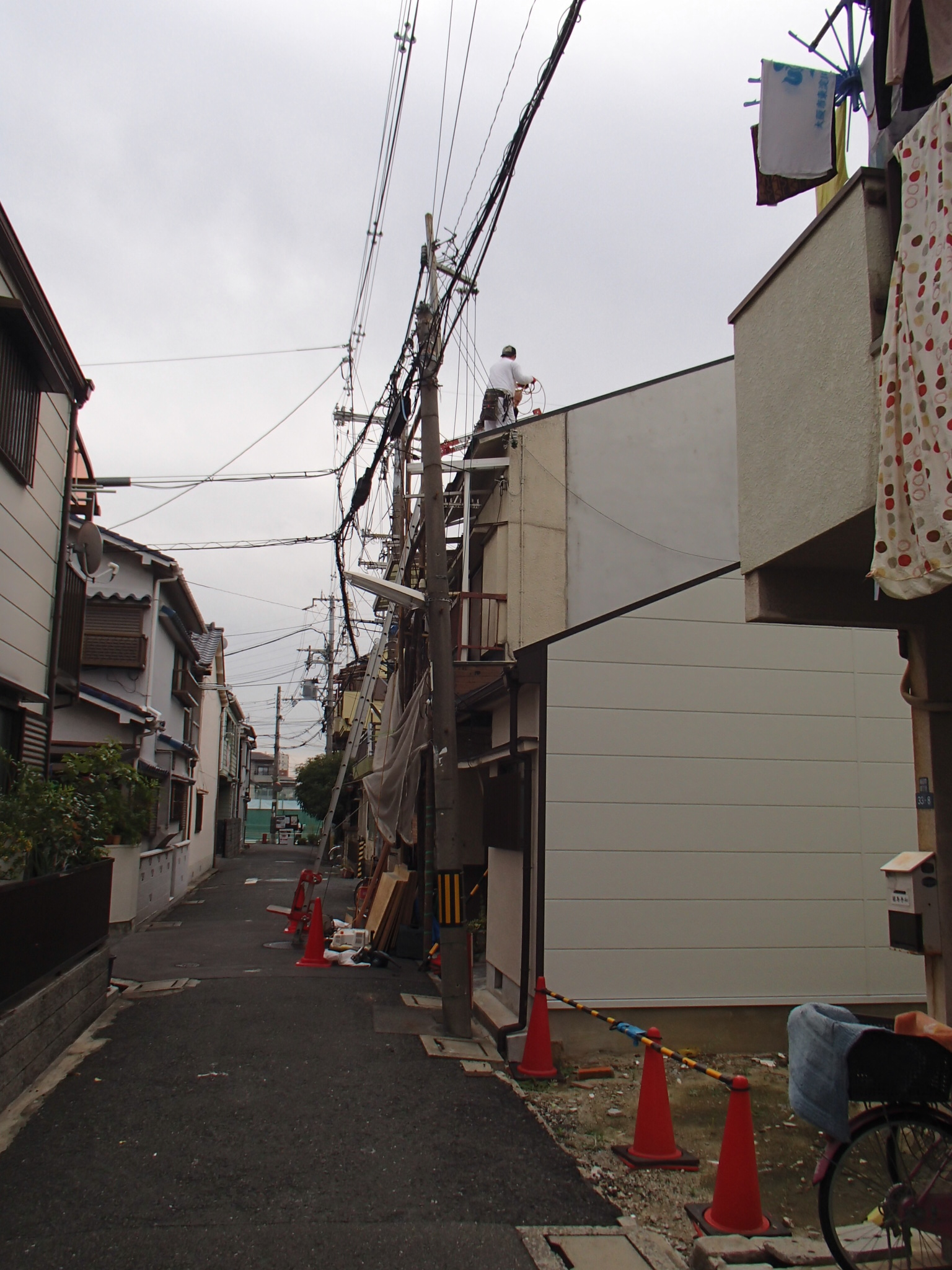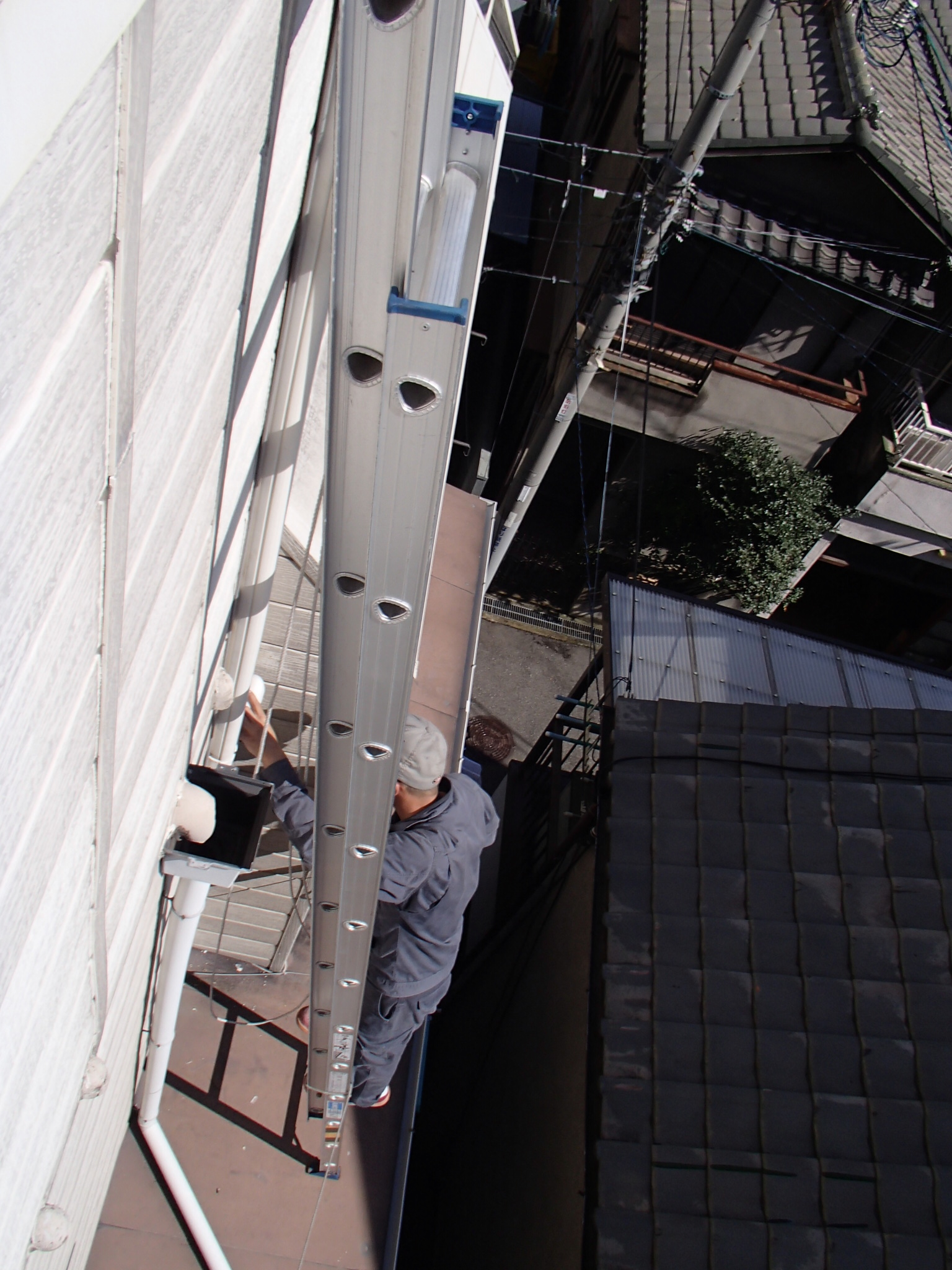 2階のひさしの上に、はしごを立てての工事です。