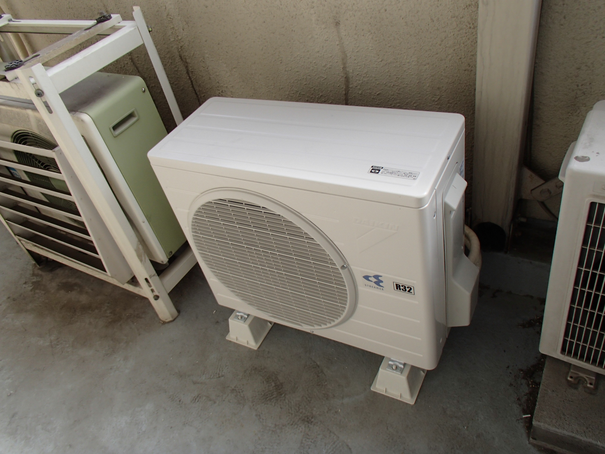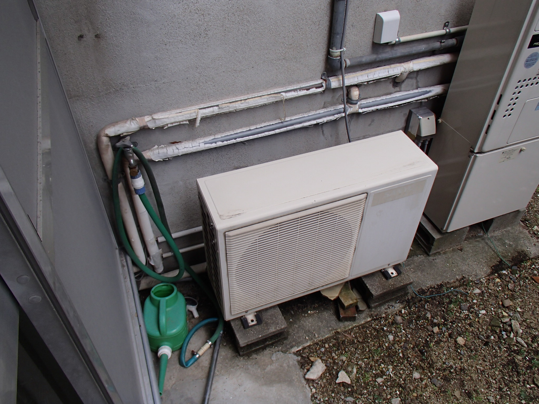 室外機は2段置き台に設置せず、横の空きスペースに設置しました。