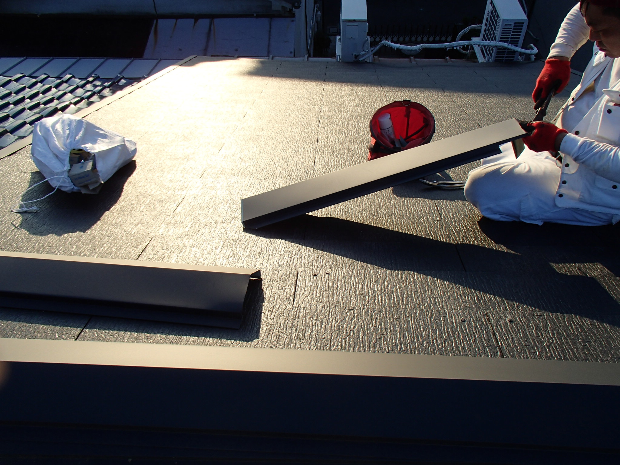 夕日が眩しい時間帯に上がってみると、棟の板金の仕上げの最中!