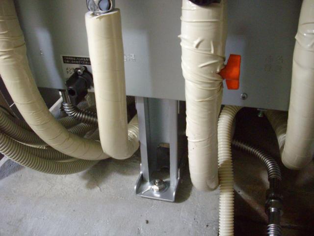 室外機の設置も完了して、タンクの配管接続部は脚部カバーを取り付けます。