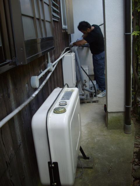 まず給水、温水、追い炊き配管を取りはずし、電源線を取り外して、撤去する段取りです。
