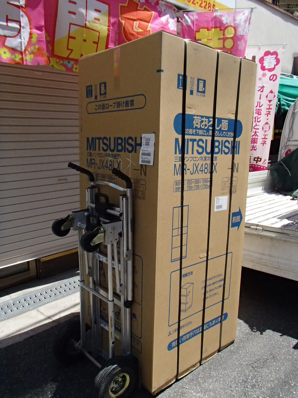 今日はひとりで この冷蔵庫をトラックの荷台に載せます。