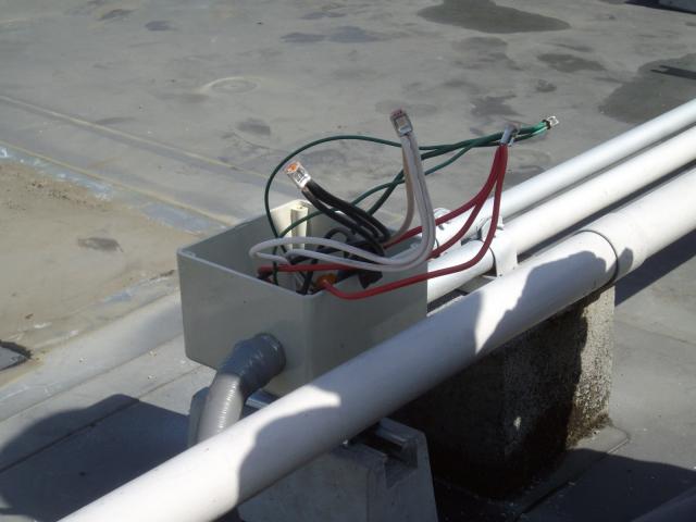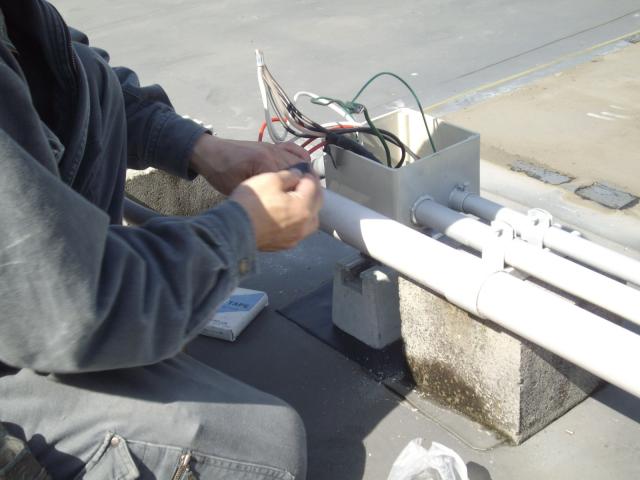 鉄管での電気配線のため、屋上の防水処理が破損しないように、しっかり養生して作業をおこないます。