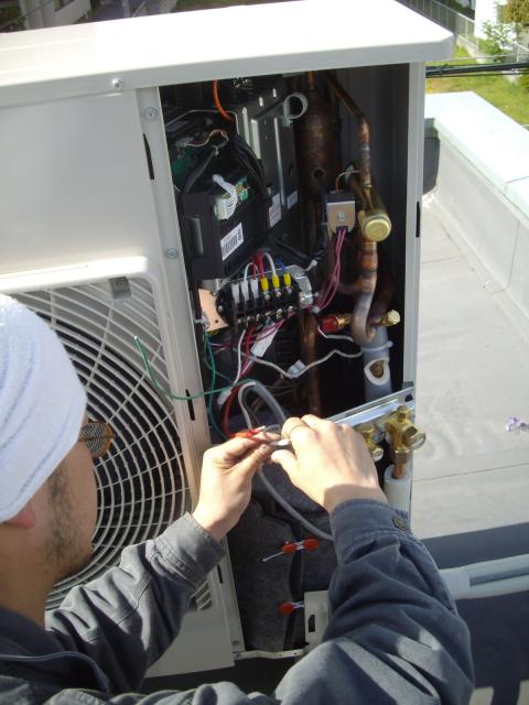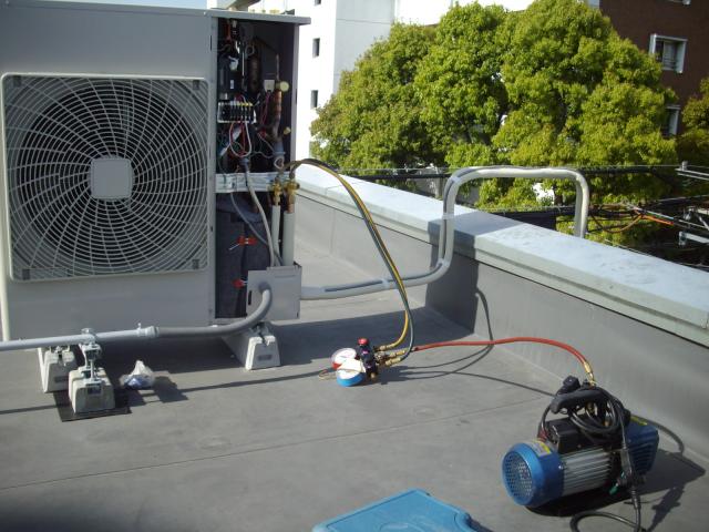 室外機側の冷媒配管と電源を接続して、真空引乾燥後、気密テストと試運転をして完了!