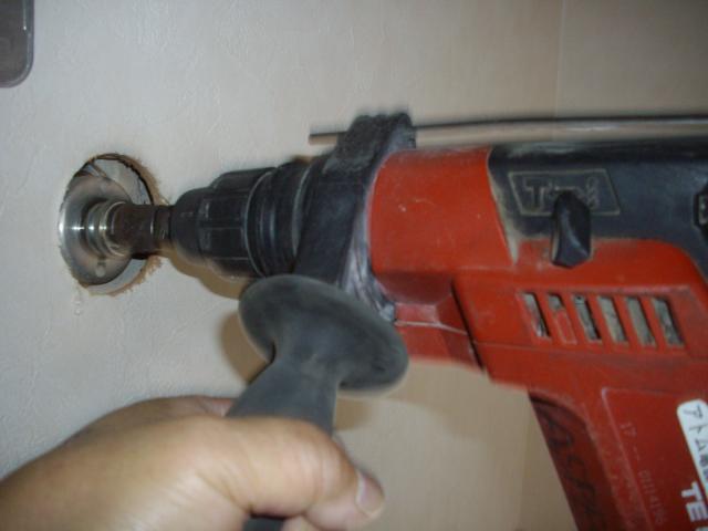 配管の穴を開けます (下り勾配で穴開け)