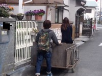 いまどきの若いお嬢さんが、昔懐かしいリヤカーを引いている。