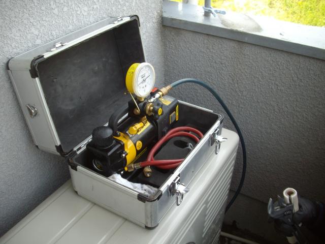 室外配管接続後は真空ポンプで真空乾燥をします。 この作業は超重要デス!!