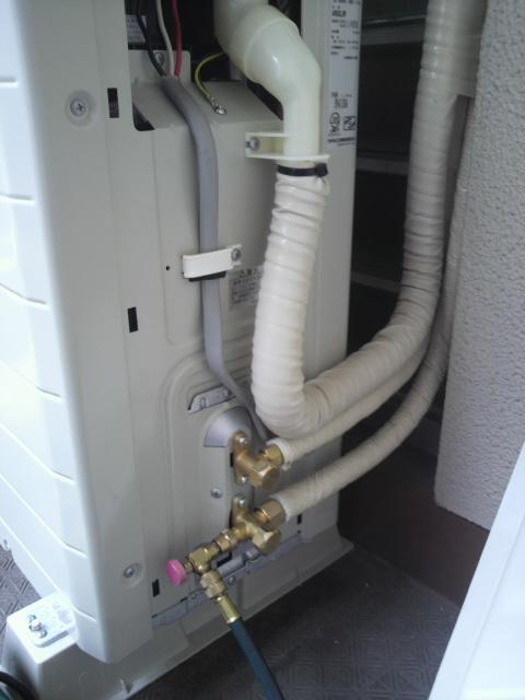 今回は左配管での工事。うるるとさららは 加湿機能付きなので加湿ホースがある分、少し工事が大変です。 既設穴が小さい場合、穴を大きくしないと入らない場合があるからです。