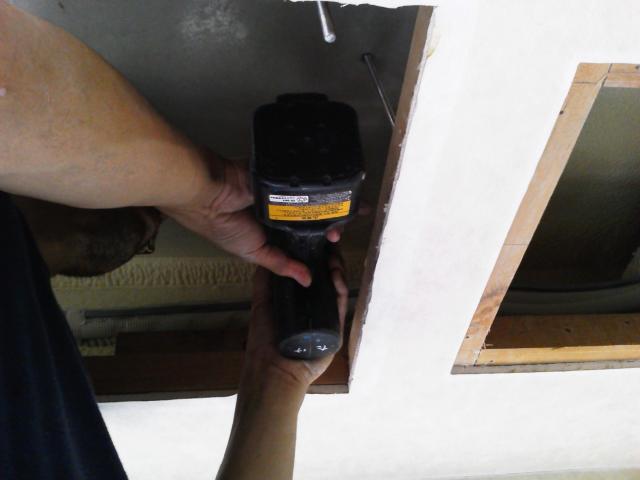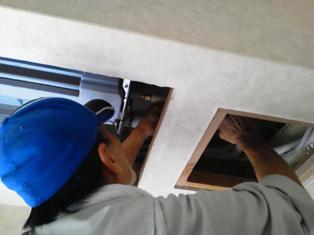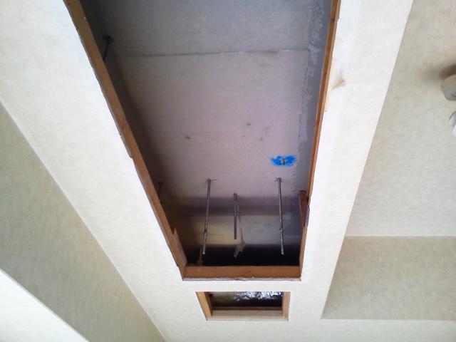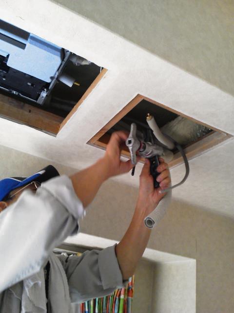エアコンを取り外したところです。天井裏の様子・・・!配管も取替します。