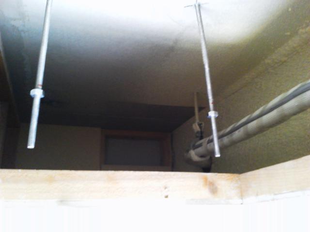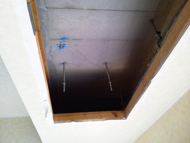 新設の配管を吊るして固定します。室内機本体の釣りボルトは赤いマークの位置で切断します。