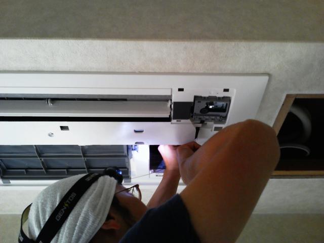 既設のエアコンはサンヨーエアコンです。パネルを外して接続配管等を取り外します。