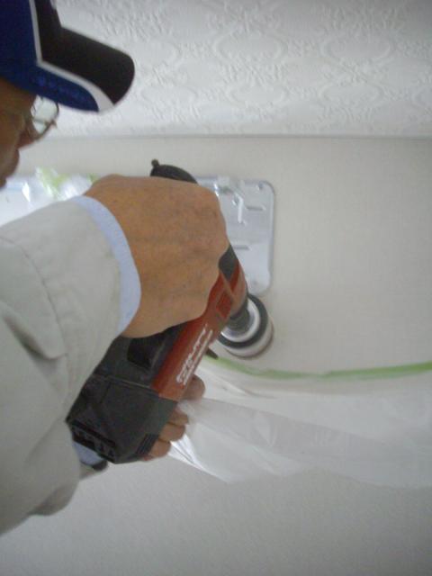 ALC壁にホルソーで穴をあけます。(周りは充分に養生をします)