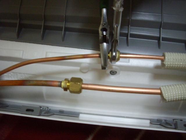 室内機の据え付け板の取り付け! 室内側のフレア配管接続です。