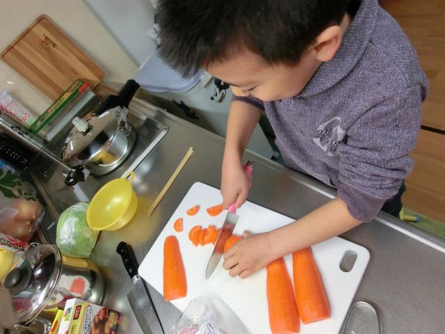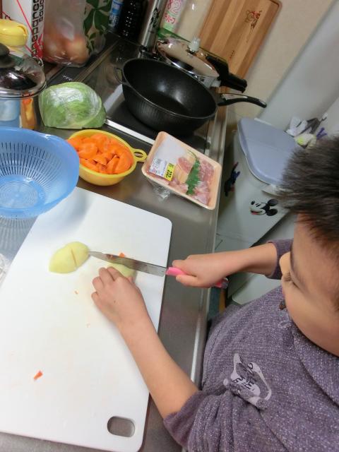 まず、にんじんとジャガイモを適当な大きさに切り分けます。