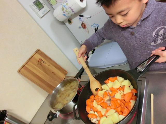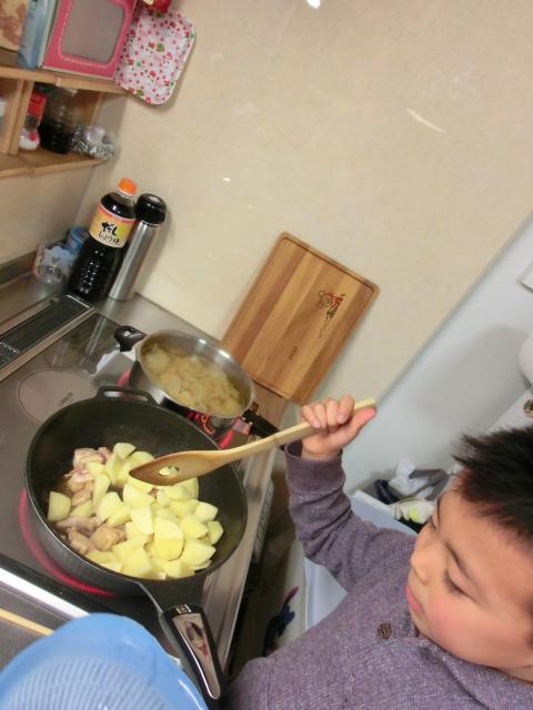 まず、お肉を炒めてからジャガイモを入れてさらに炒めます。