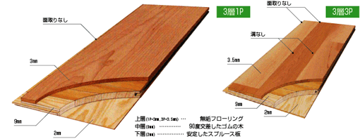 3層フローリングは3枚の異なる層でできていて、湿気等による木の伸縮を最小限に抑えることができます。 -