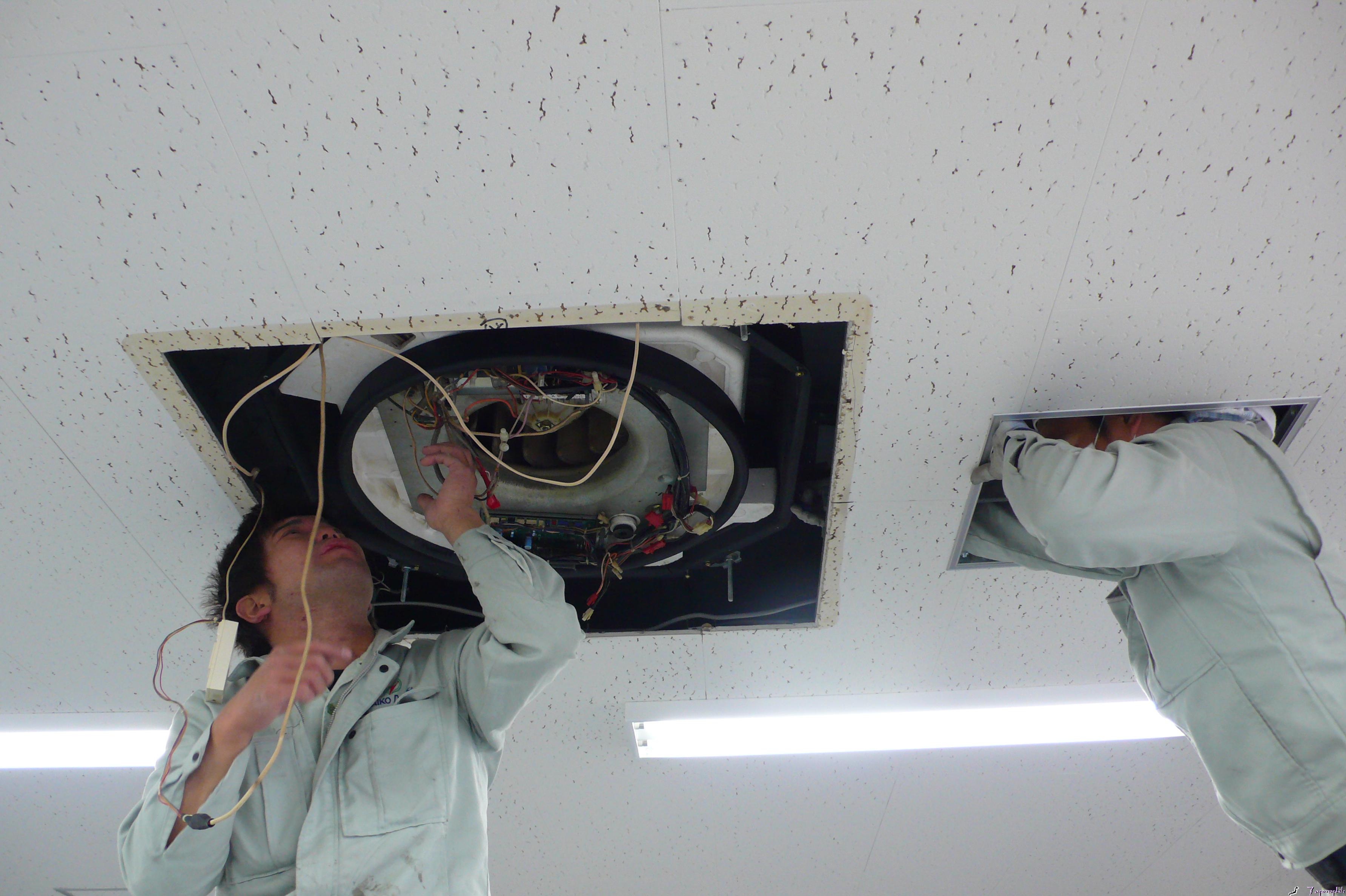 設計事務所での交換工事です。従来のエアコンは経年劣化が目立ち温度変化にむらがあり設計室内の環境管理に問題がありました。特に冬の暖房は室内が暖まりにくく屋外機の霜取り運転中は、暖房の吹き出しが30分位止まってしまうので、寒い時はすぐに室内の温度が下がってしまい足元が冷えて電気ストーブを置かなくては仕事が出来ない状態でした。過去の工事経験から、三菱寒冷地向ズバ暖エアコン(天井カセット同時ツインP160型を2セット)の設置をご提案しました。この機種の特徴はムーブアイで室内・床・人の温度を感知して温度調節をし、人の出入りで扉の開け閉めが多くても温度ムラがなく外気温度がマイナス」15℃でスイッチを入れてから約5分で吹出し温風が50℃位になります、霜取りの回数は少なく4分程度ですし、風の当りが少なく図面や書類を広げても飛ばされなく、一番良い事は使用する電気代が従来よりずっと軽減され経費削減になります。