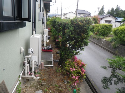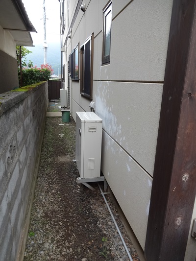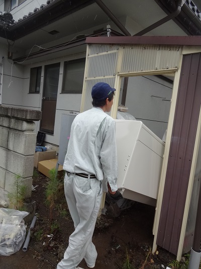 狭い場所の灯油給湯器を設置場所を変更してエコキュートを設置します。長野県長野市エコキュート工事・エコ電化本舗㈱大光電気商会