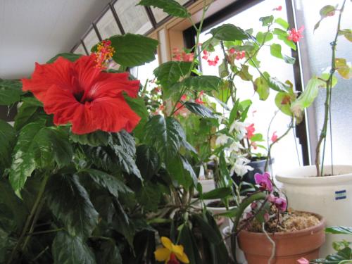 蓄熱暖房器のおかげで、今年最初のハイビスカスの花が夜中でも暖かい事務所の中で咲きました。