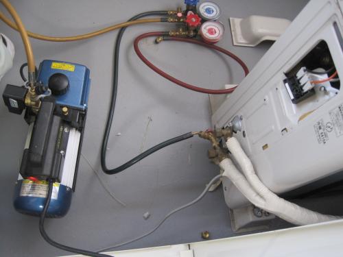 エアコンの取付工事です!エアコンの設置工事では、冷媒ガスを大気中に漏らさないように真空ポンプを使用します。【長野県長野市マンションのエアコン取付工事】【長野県長野市電気工事】【長野県長野市オール電化工事】【街の電気工事やさん】エコ電化JP【大光電気商会】へお任せ下さい。