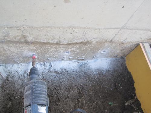 住宅の基礎に鉄筋アンカーを打ちこむ穴をあけます
